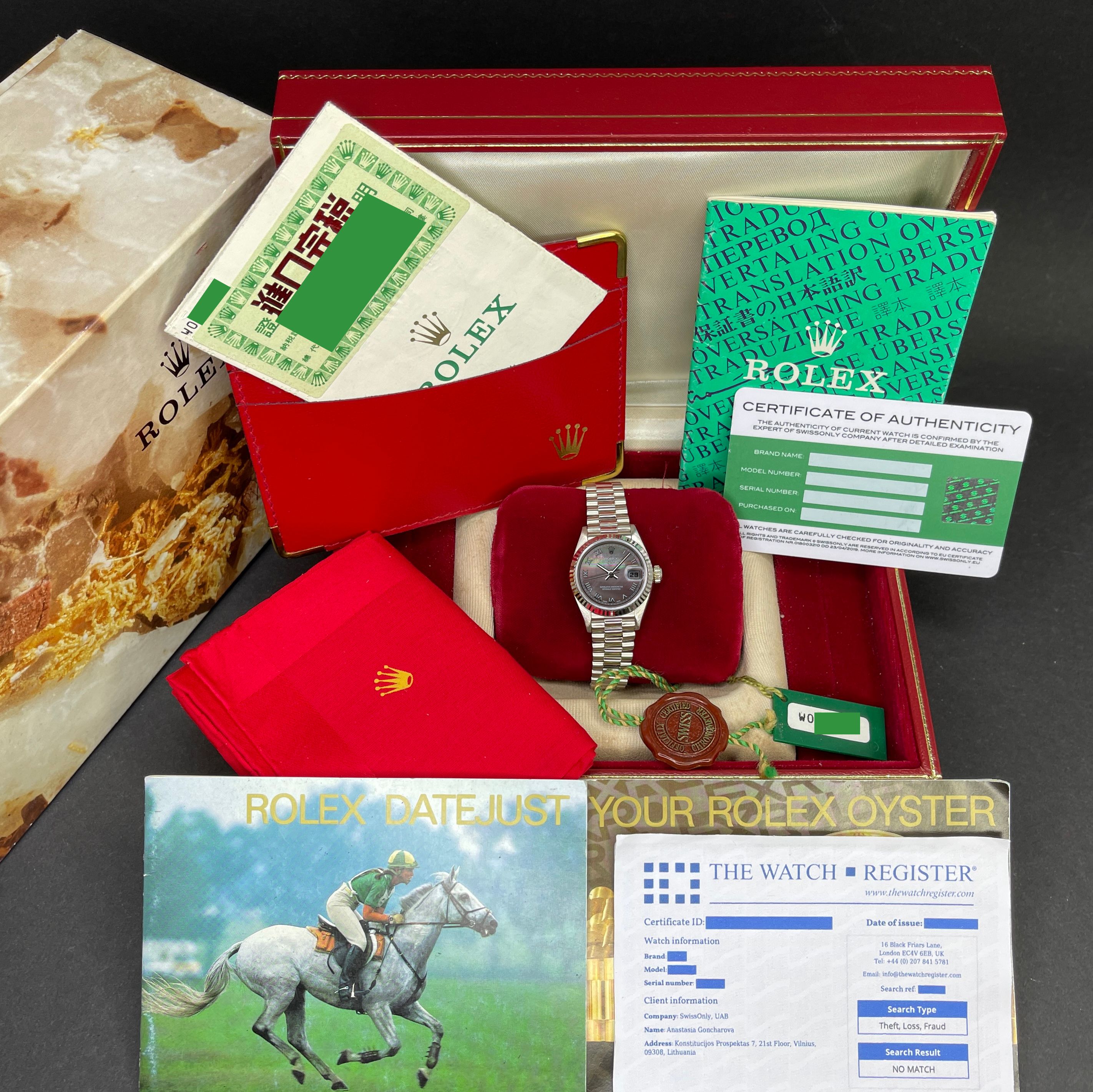 Rolex Lady Datejust, 69179, 26mm, 1995, White gold, Tahitian MOP Roman dial, Fullset, 1y warranty