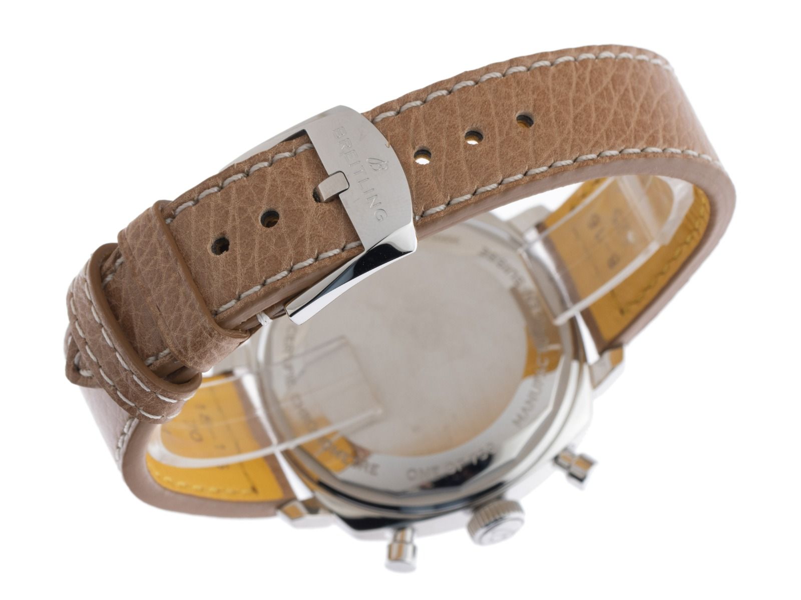 Caja de acero pulido y satinado, diámetro de la caja sin corona 38mm, altura de la caja 13,7mm. Bezel de acero liso y pulido. Correa de piel beige con costura decorativa clara, ancho de asas 18mm, hebilla de pasador de acero con logo del fabricante. Esfera negra con índices luminosos de acero aplicados y agujas luminosas de acero. Movimiento automático, cronógrafo, cronómetro con certificado, calibre Breitling 01 con 34 piedras preciosas, reserva de marcha de aproximadamente 70 horas. Indicación de horas y minutos a través de agujas centrales, segundero pequeño con parada de segundos para un ajuste preciso de la hora a las 9 en punto. Cristal de zafiro resistente a los arañazos y antirreflejos por ambas caras. Corona con logo del fabricante. Fondo de acero atornillado. Peso del reloj incluyendo la correa 77g. Resistente al agua hasta 10 ATM. Número de referencia: AB01771A1B1X1, ID: ST5806100060925H-7250, número de artículo: 10000082516. Caja original de Breitling y documentos de garantía de 2025, Full Set. Limitado a 750 ejemplares. Sin usar. Tiempo de entrega inmediato.