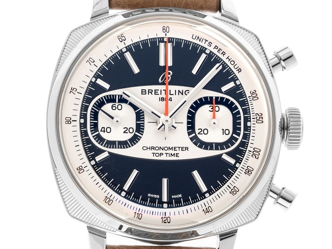 Breitling Top Time B01 Racing LimitiertStahl Automatik Chronograph Armband LederGehäuse Edelstahl poliert und satiniert, Gehäusedurchmesser ohne Krone 38mm, Gehäusehöhe 13,7mm. Lünette Edelstahl glatt und poliert. Armband Leder beige mit heller Ziernaht, Anstoßbreite 18mm, Stiftschließe Edelstahl mit Hersteller-Logo. Zifferblatt schwarz mit aufgesetzten Edelstahl Leuchtindexen und Edelstahl Leuchtzeigern. Uhrwerk Automatik, Chronograph, Chronometer mit Zeugnis, Kaliber Breitling 01 mit 34 Edelsteinen, Gangreserve ca. 70 Stunden. Anzeige von Stunde und Minute über Zeiger aus der Mitte, kleine Sekunde mit Sekundenstopp zur sekundengenauen Einstellung der Uhrzeit bei 9 Uhr. Saphirglas kratzfest und doppelseitig entspiegelt. Krone mit Hersteller-Logo. Boden Edelstahl verschraubt. Gewicht der Uhr inklusive Armband 77g. Wasserdicht bis 10 ATM. Referenznummer: AB01771A1B1X1, ID: ST5806100060925H-7250, Artikelnummer: 10000082516. Original Breitling Box und Garantie Papiere von 2025, Full Set. Limitiert auf 750 Exemplare. Ungetragen. Lieferzeit sofort.