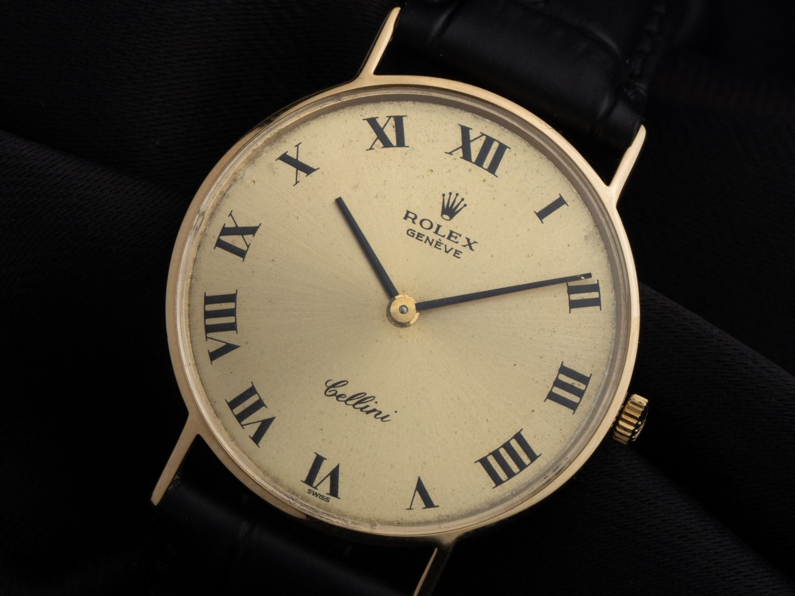 Rolex Cellini Medium 18kt Gelbgold Handaufzug Armband KrokolederGehäuse 18kt Gelbgold poliert, Gehäusedurchmesser ohne Krone 31mm, Gehäusehöhe 5,5mm. Armband Rolex Krokoleder schwarz mit Ziernaht, Anstoßbreite 17mm, Rolex Stiftschließe 18kt Gelbgold mit Hersteller-Logo. Zifferblatt champagnerfarben mit römischen Ziffern und schwarzen Zeigern. Uhrwerk Handaufzug, Rolex Manufakturkaliber 1600 mit 19 Edelsteinen. Anzeige von Stunde und Minute über Zeiger aus der Mitte. Saphirglas kratzfest. Krone mit Hersteller-Logo. Boden 18kt Gelbgold graviert. Gewicht der Uhr inklusive Armband 34g. Referenznummer: 3833, Gehäusenummer: 3673XXX, Baujahr: 1973, ID: P166962781025H-6800, Artikelnummer: 10000082579. Mit Gangkontrolle und kompletter äußerlicher Aufarbeitung von Oktober 2025. Original Rolex Cellini Box mit Umkarton und Garantie Papiere von Oktober 1975, LC 110 France / EU, Beschreibung, Ledermäppchen, Übersetzungsheft, Rolex Chronometer-Siegel sowie Watchregister Auszug von Oktober 2025, The Watch Register Zertifikat / ohne Eintrag (Internationale Datenbank für verlorene oder gestohlene Uhren), Full Set. Kapitalanlage mit Wertsteigerungspotential, extrem seltenes Sammlerstück. Sehr guter Zustand. Lieferzeit sofort.