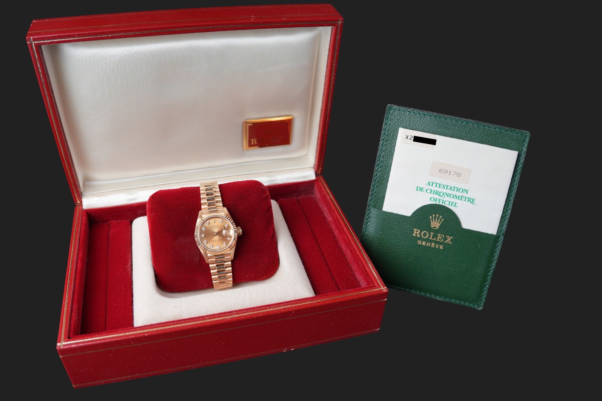 Dial colour is champagne with diamond index.Originally sold by Rolex 07/1993, LC413 (Korea).