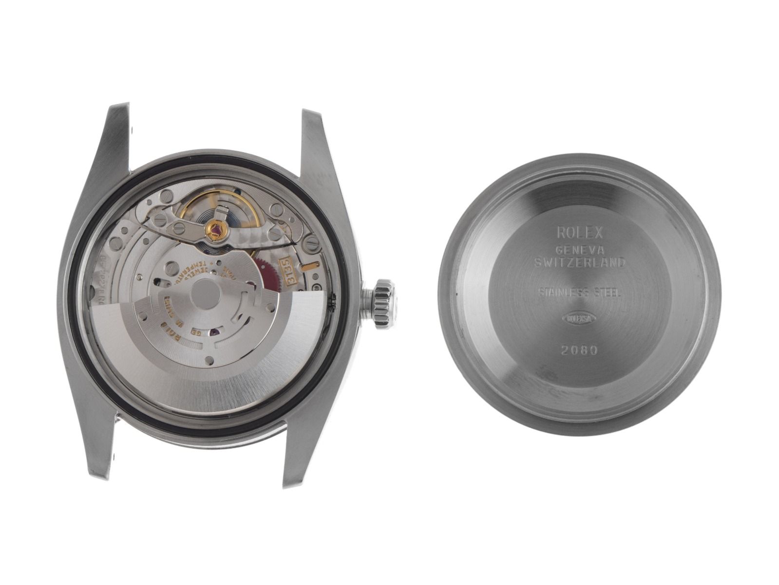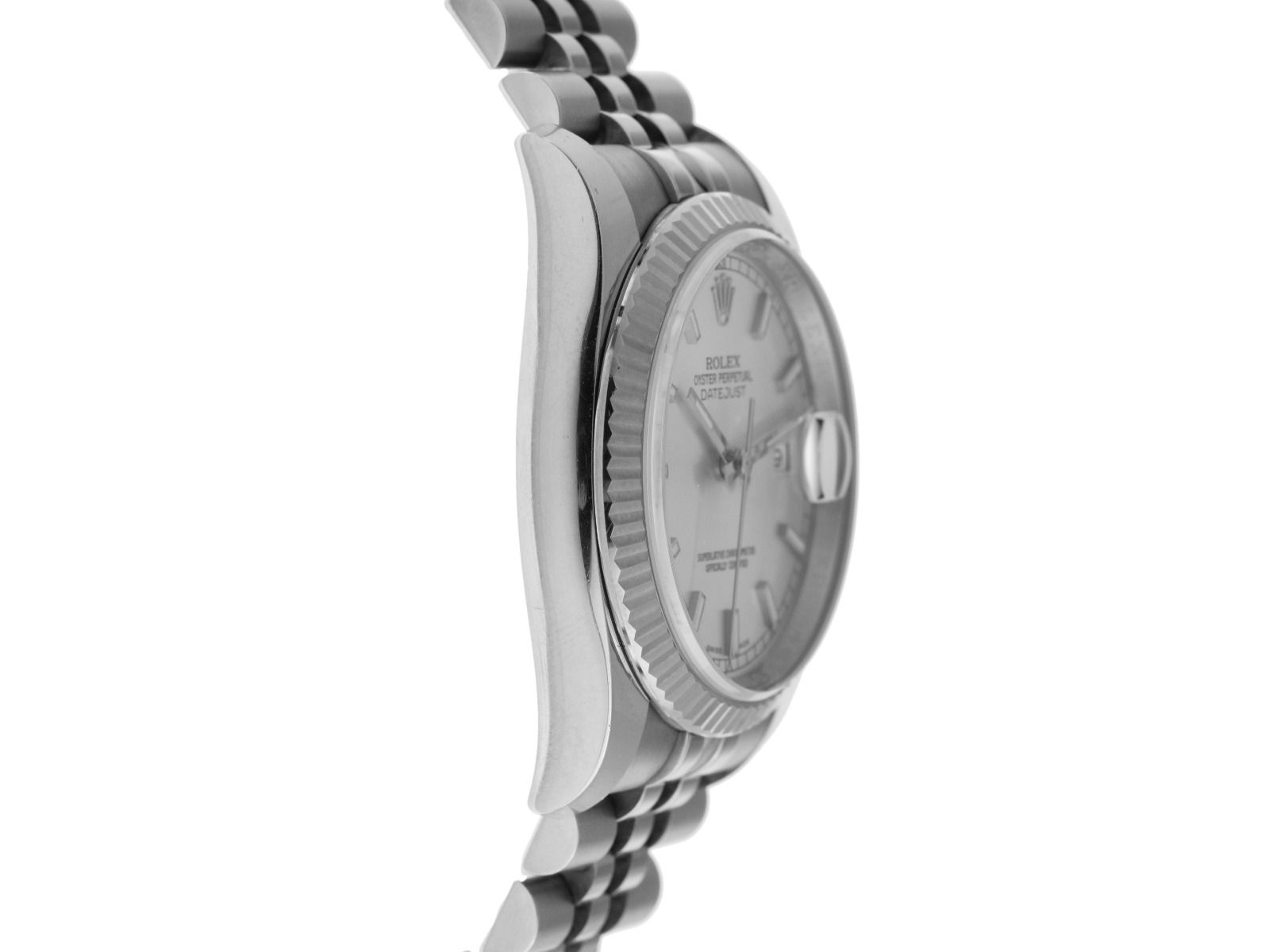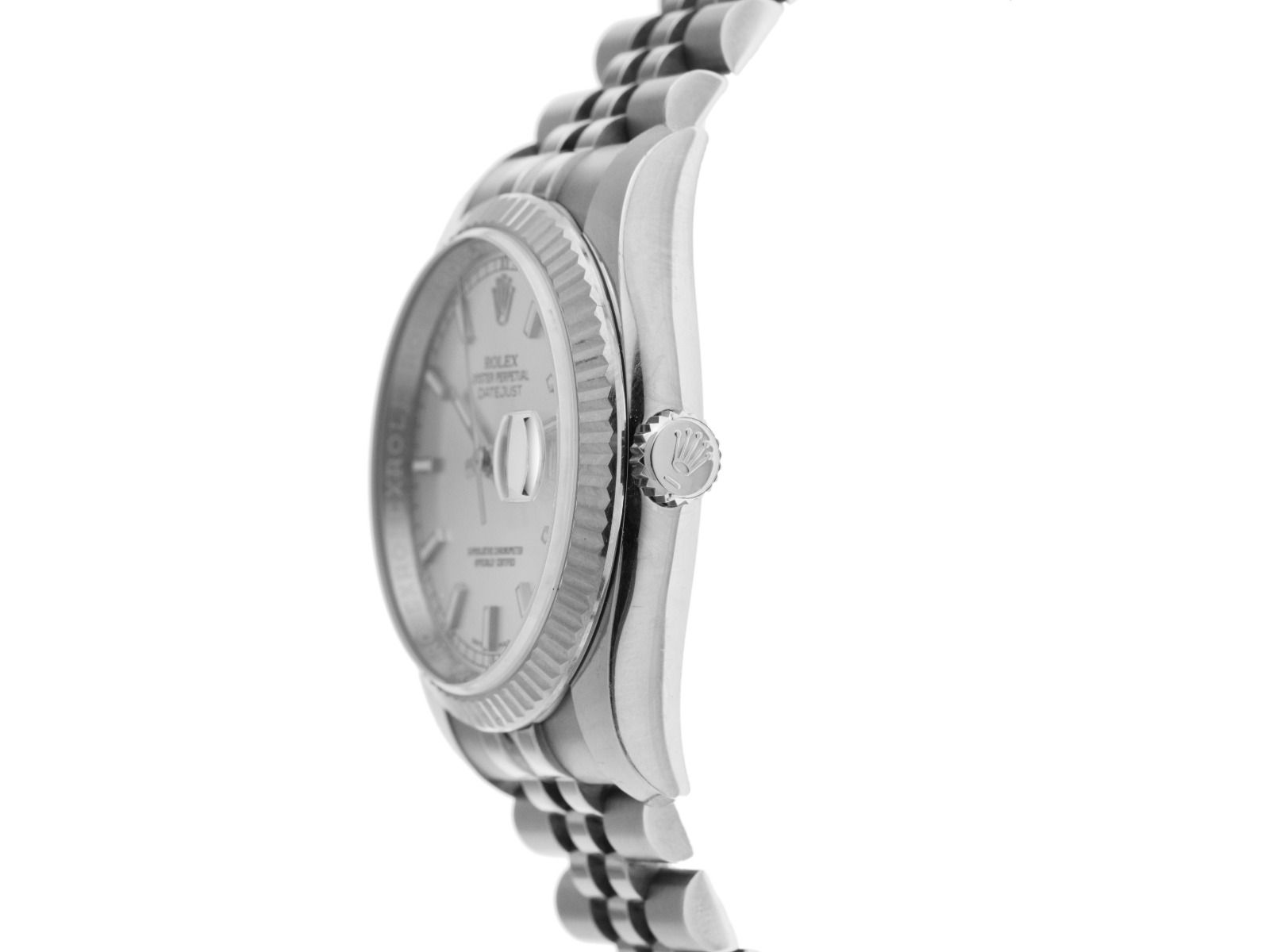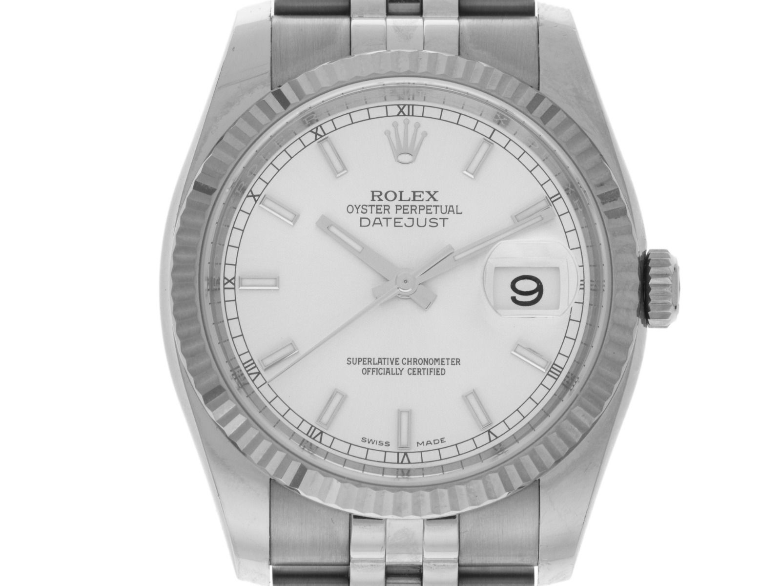 Caja de acero inoxidable pulido y satinado, diámetro de la caja sin corona 36mm, altura de la caja 11,7mm. Bisel de 18kt oro blanco pulido y estriado. Pulsera Jubilé de acero inoxidable pulido y satinado, cierre desplegable Crownclasp oculto de acero inoxidable con logo del fabricante. Esfera color plata con índices aplicados y agujas en oro blanco. Movimiento automático, cronómetro con certificado, calibre de manufactura Rolex 3135 con 31 piedras preciosas. Indicación de horas, minutos y segundos a través de agujas centrales con parada de segundos para un ajuste preciso de la hora, visualización de la fecha con ajuste rápido bajo cristal de lupa a las 3 en punto. Cristal de zafiro resistente a los arañazos. Corona atornillada con logo del fabricante. Fondo de acero atornillado. Peso del reloj incluyendo la pulsera 115g, longitud de la pulsera incluyendo la caja 175mm. Número de referencia: 116234, número de caja: N8019XXX, ID: P1702168001025H-12800, número de artículo: 10000082585. Con control de marcha y reacondicionamiento exterior completo de octubre de 2025. Caja original de Rolex con caja exterior y documentos de garantía de abril de 2019, así como descripción, estuche de cuero, etiqueta, sello de cronómetro Rolex, LC 100 / Alemania UE y extracto de Watchregister de octubre de 2025, certificado de The Watch Register / sin entrada (base de datos internacional de relojes perdidos o robados), incluyendo factura de compra original, Full Set. Inversión con potencial de apreciación. Como nuevo. Tiempo de entrega inmediato.