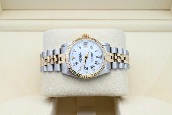 Rolex Datejust 68273 from 1989 with the white diamond dial in excellent condition, including the original box and papers.All of our watches have been thoroughly checked by our own watchmaker and serviced when needed.