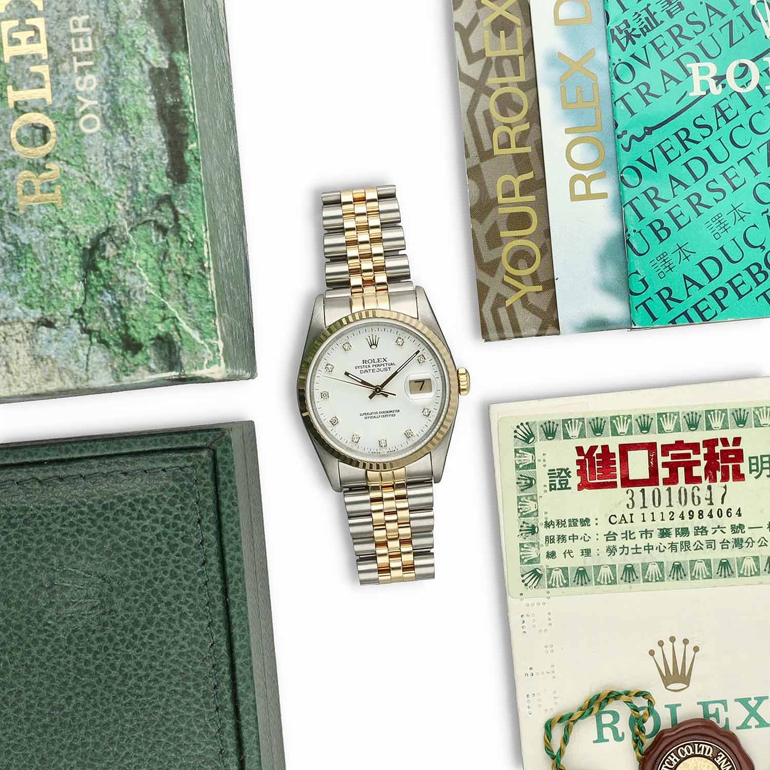 Rolex Datejust 16233 – White Small Diamonds Dial (1991)The Rolex Datejust 16233 from 1991 is a timeless example of classic Rolex craftsmanship. This elegant configuration comes as a full set, including the original box, papers, booklets, and accessories.