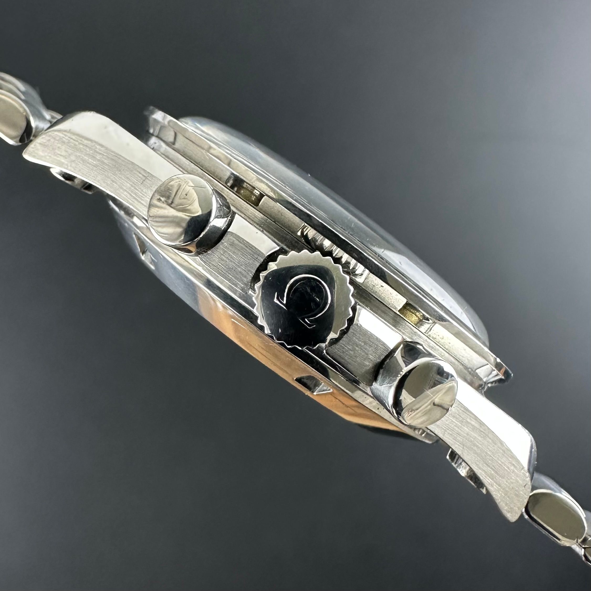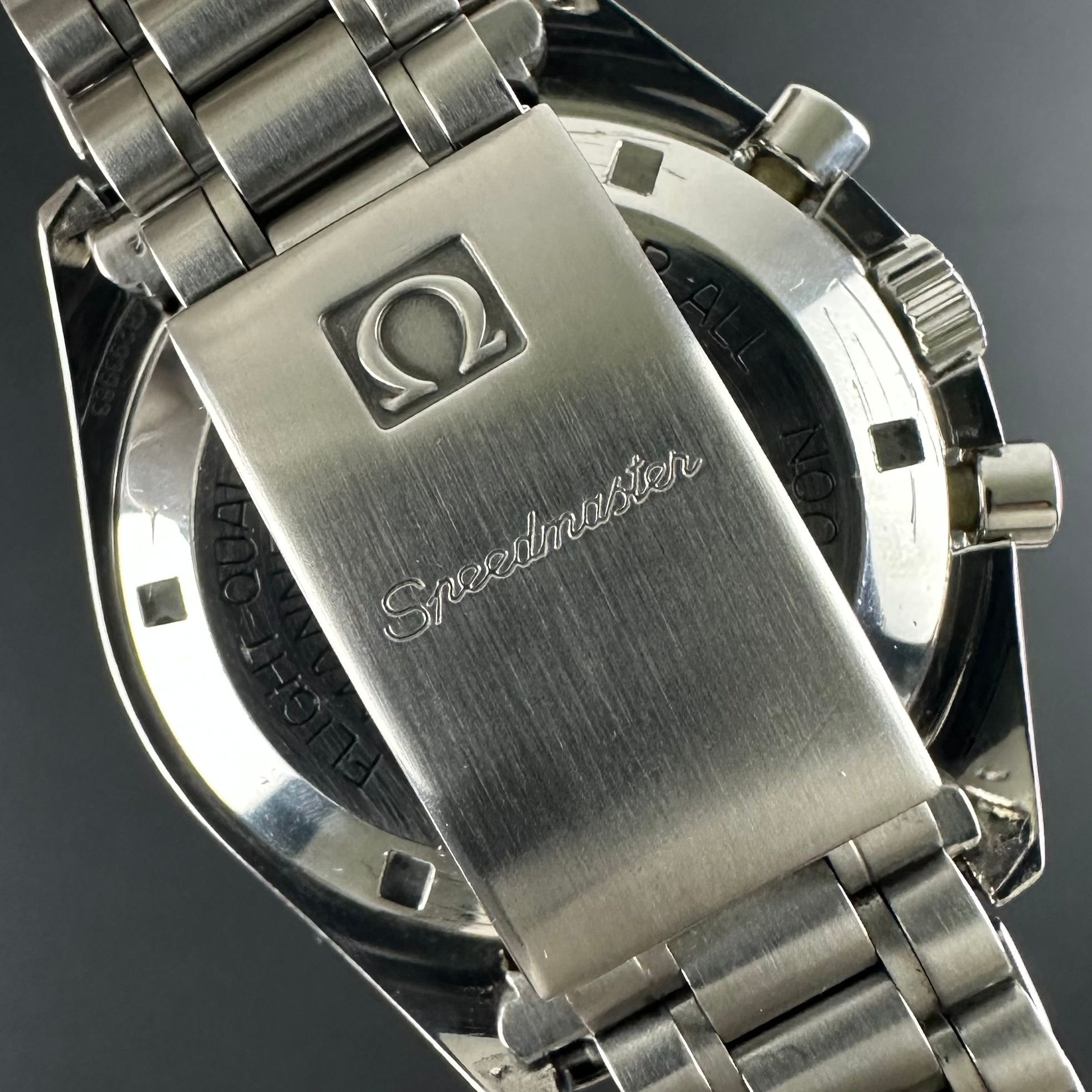 La caja mantiene su pulido original con un desgaste mínimo, algunos rasguños visibles en la parte posterior. El reloj sigue siendo completamente original y viene con su pulsera Omega Speedmaster original (ref. 1479, eslabones finales 812), que se adapta a muñecas de 14,5 a 20 cm, adecuada para tamaños de muñeca pequeños a grandes.