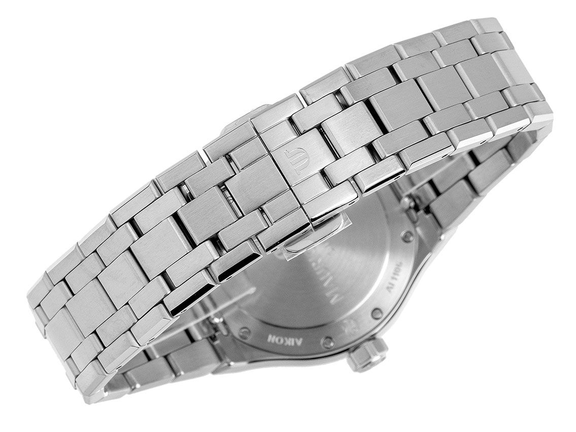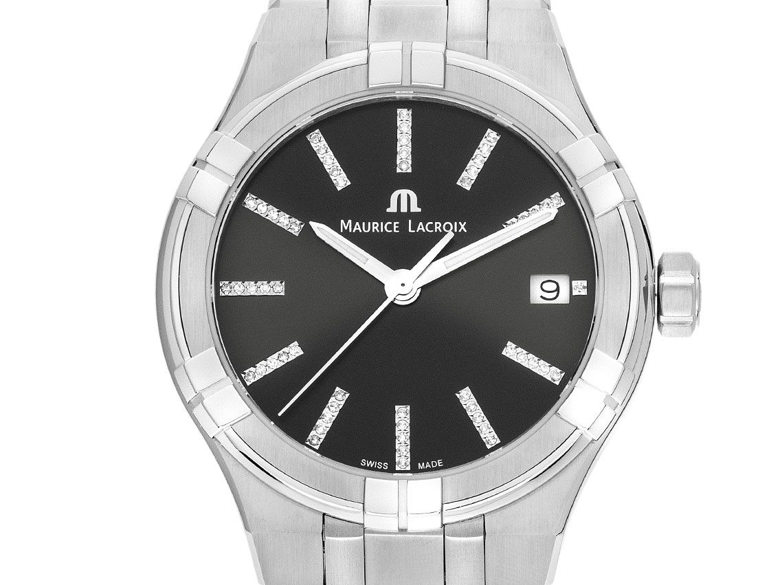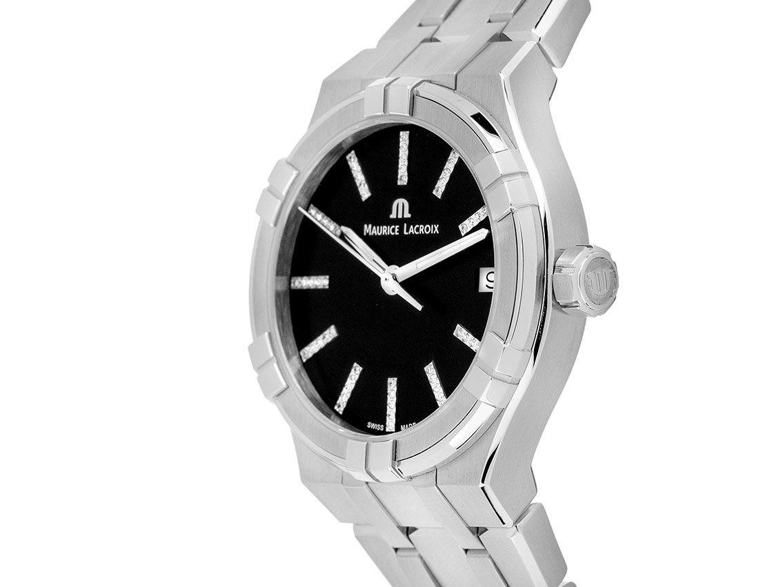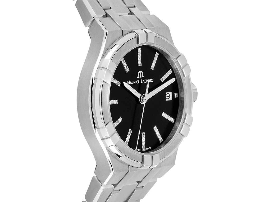 Caja de acero inoxidable pulido y satinado, diámetro de la caja sin corona 35mm, altura de la caja 10,0mm, bisel de acero satinado con estribos pulidos. Pulsera de acero inoxidable pulido y satinado con sistema de cambio rápido «Easy Change», cierre desplegable de doble seguridad oculto de acero inoxidable con el logo del fabricante. Esfera negra con índices de diamante aplicados y agujas luminiscentes de acero inoxidable. Movimiento de cuarzo, calibre Ronda 515. Indicación de horas, minutos y segundos a través de agujas centrales con parada de segundos para un ajuste preciso de la hora, visualización de la fecha con ajuste rápido a las 3 en punto. Cristal de zafiro resistente a los arañazos. Corona atornillada con el logo del fabricante. Fondo de acero atornillado 7 veces y grabado. Peso del reloj incluyendo la pulsera 120g, longitud de la pulsera incluyendo la caja 180mm. Resistente al agua hasta 10 ATM. Número de referencia: AI1106-SS002-350-1, número de caja: BB63XXX, ID: ST197513680724H-1200, número de artículo: 10000073294. Caja original de Maurice Lacroix con caja exterior y documentos de garantía, Full Set. Nuevo. Tiempo de entrega inmediato.