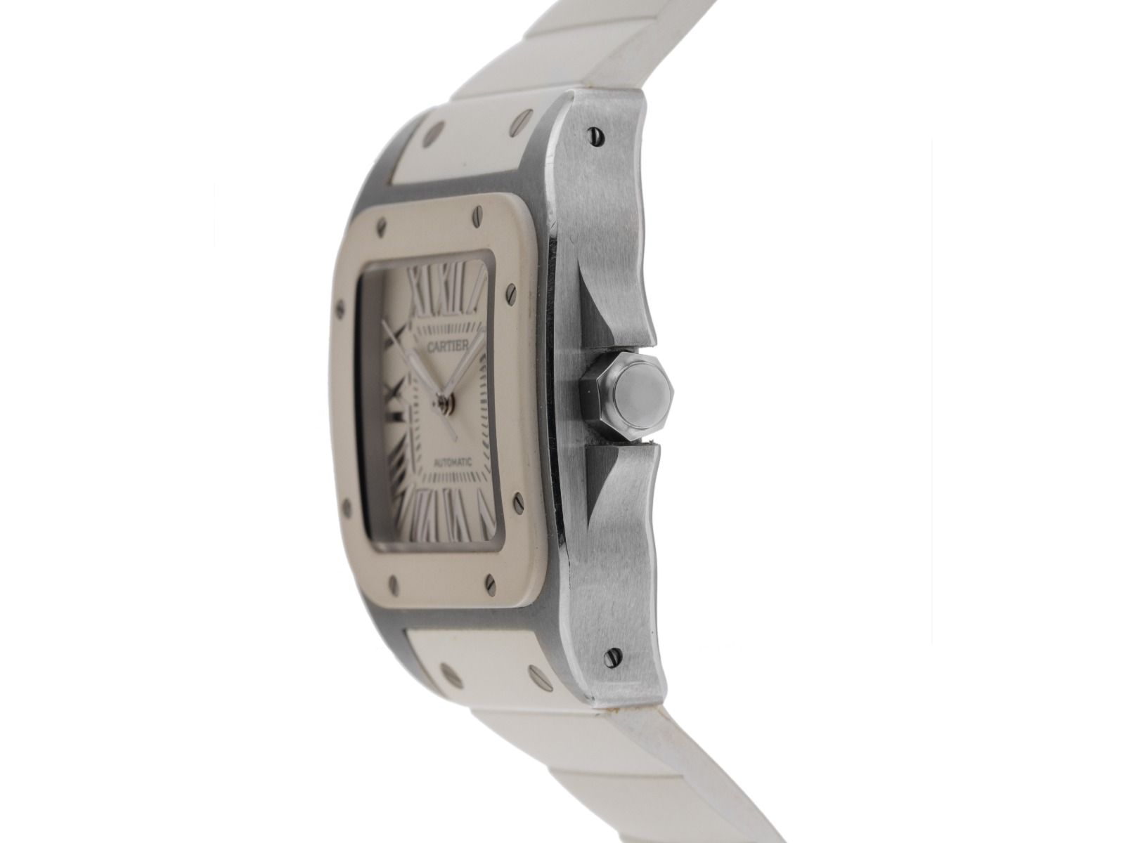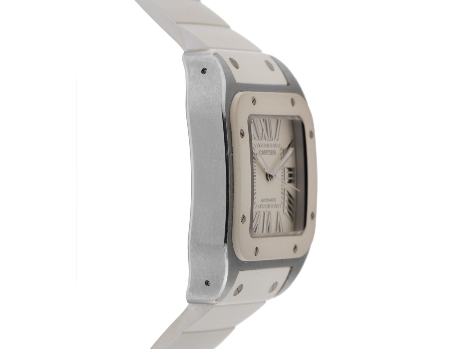 Cartier Santos 100 Ivory GM Großes Modell Stahl Automatik Armband KautschukGehäuse Edelstahl poliert und satiniert, Gehäusemaße ohne Krone 44 x 33mm, Gehäusehöhe 10,9mm. Lünette Kautschuk 8-fach verschraubt. Armband Kautschuk weiß, Anstoßbreite 20mm, Cartier Stiftschließe Edelstahl mit Hersteller-Logo. Zifferblatt weiß mit aufgesetzten römischen Ziffern und Edelstahl Zeigern. Uhrwerk Automatik. Anzeige von Stunde, Minute und Sekunde über Zeiger aus der Mitte mit Sekundenstopp zur sekundengenauen Einstellung der Uhrzeit. Saphirglas kratzfest und gewölbt. Krone mit Flankenschutz und weißem Spinell. Boden Edelstahl 8-fach verschraubt und graviert. Gewicht der Uhr inklusive Armband 94g. Referenznummer: 2656, Gehäusenummer: 20812XXX, ID: P176360001025H-6300, Artikelnummer: 10000082743. Mit Gangkontrolle und kompletter äußerlicher Aufarbeitung von Oktober 2025. Original Cartier Box mit Umkarton und Garantie Papiere von Juli 2007, Beschreibung sowie Watchregister Auszug von Oktober 2025, The Watch Register Zertifikat / ohne Eintrag (Internationale Datenbank für verlorene oder gestohlene Uhren), Full Set. Wie Neu. Lieferzeit sofort.