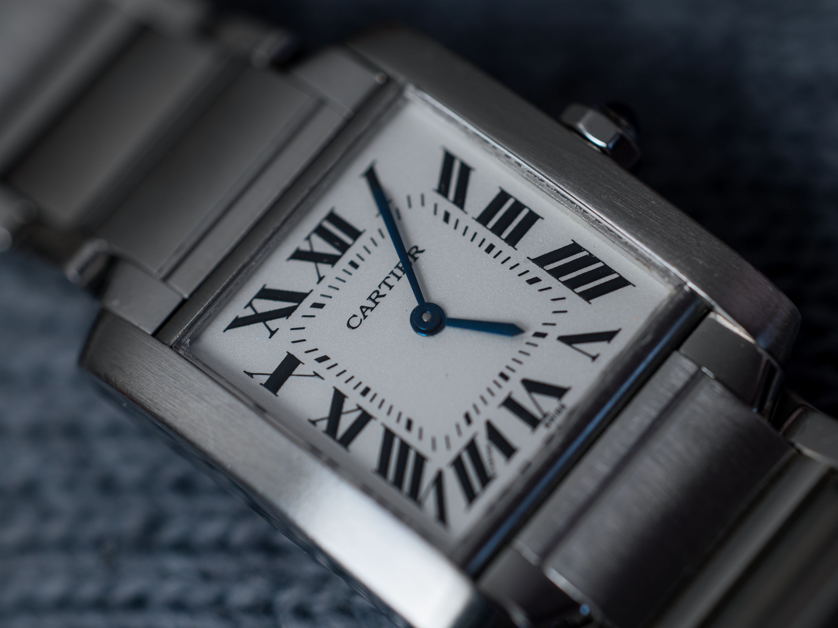 Cuenta con una esfera blanca con agujas azules, tratadas al calor, y los icónicos números romanos que definen la herencia de la línea Tank.