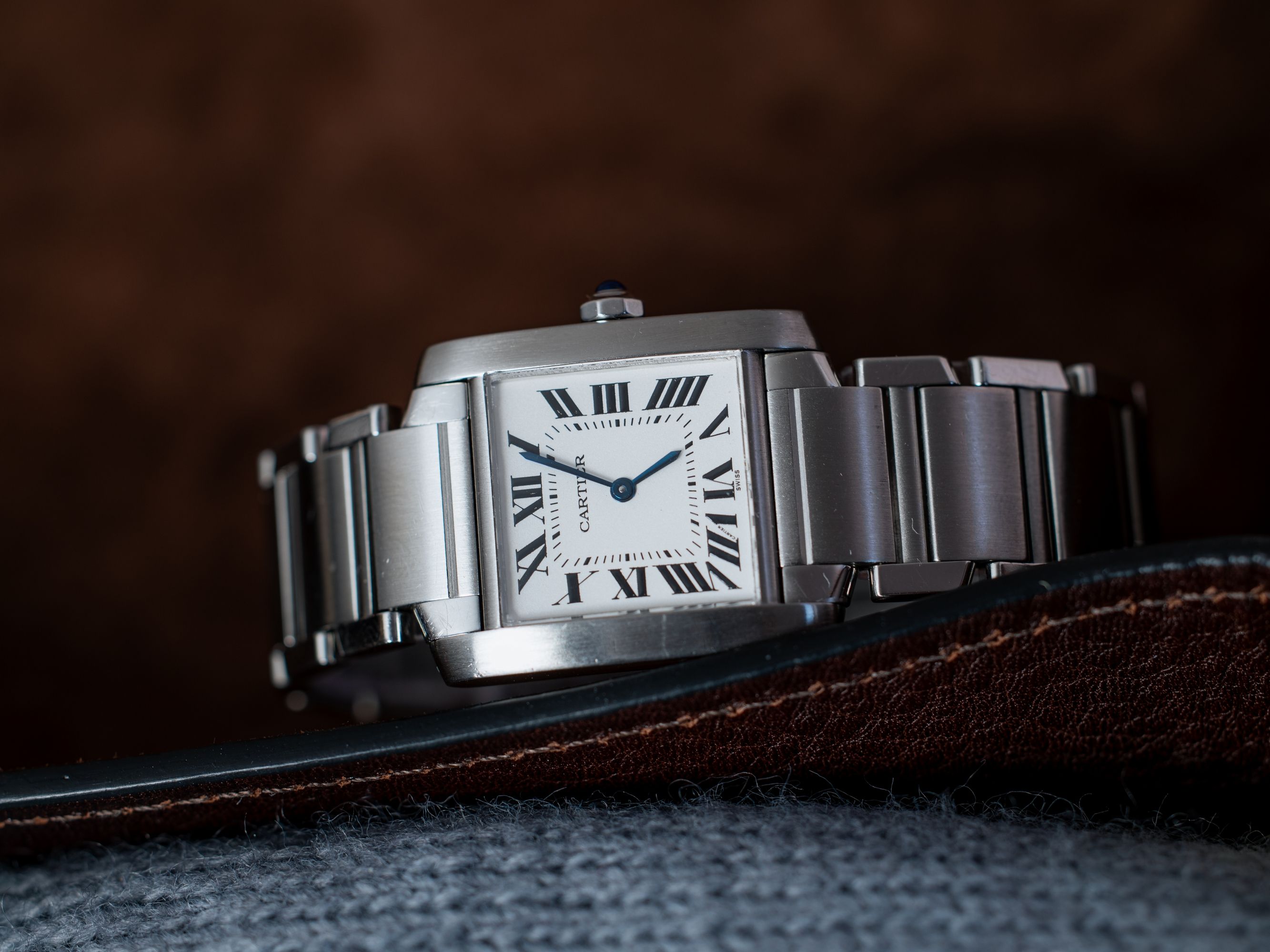 It features a white dial with blue, heat-blued hands, and the iconic Roman numerals that define the heritage of the Tank line.