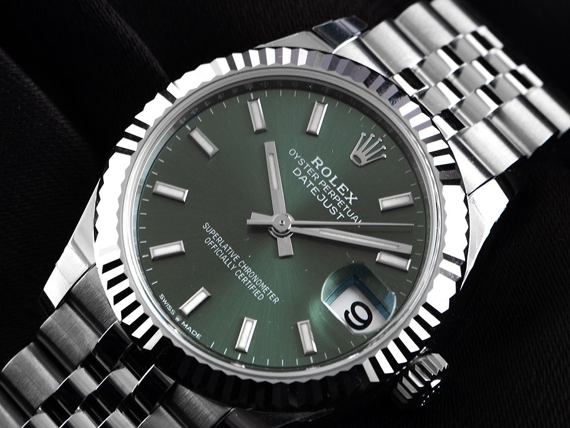 Caja de acero pulido y satinado, diámetro de la caja sin corona 31mm, altura de la caja 10,6mm. Bisel de 18kt oro blanco estriado y pulido. Pulsera Jubilé de acero pulido y satinado, cierre desplegable oculto Crownclasp de acero con logo del fabricante. Esfera verde menta con índices de oro blanco aplicados y manecillas de oro blanco. Movimiento automático, cronómetro con certificado, calibre de manufactura Rolex 2236 con 31 rubíes. Indicación de horas, minutos y segundos a través de manecillas centrales con parada de segundos para un ajuste preciso de la hora, visualización de la fecha con ajuste rápido bajo lupa a las 3 en punto. Cristal de zafiro resistente a los arañazos. Corona atornillada con logo del fabricante. Fondo de acero atornillado. Peso del reloj incluyendo la pulsera 82g, longitud de la pulsera incluyendo la caja 160mm. Resistente al agua hasta 10 ATM. Número de referencia: 278274, número de caja: 0897YXXX, ID: P1003185000625H-14200/8950, número de artículo: 10000080607. Caja original de Rolex con caja exterior y documentos de garantía de julio de 2021, nueva tarjeta de garantía de Rolex sin código de país, así como descripción, estuche de cuero con sello de cronómetro Rolex y extracto del registro de relojes de junio de 2025, certificado de The Watch Register / sin entrada (base de datos internacional de relojes perdidos o robados), set completo. Inversión con potencial de revalorización. Como nuevo. Tiempo de entrega inmediato.