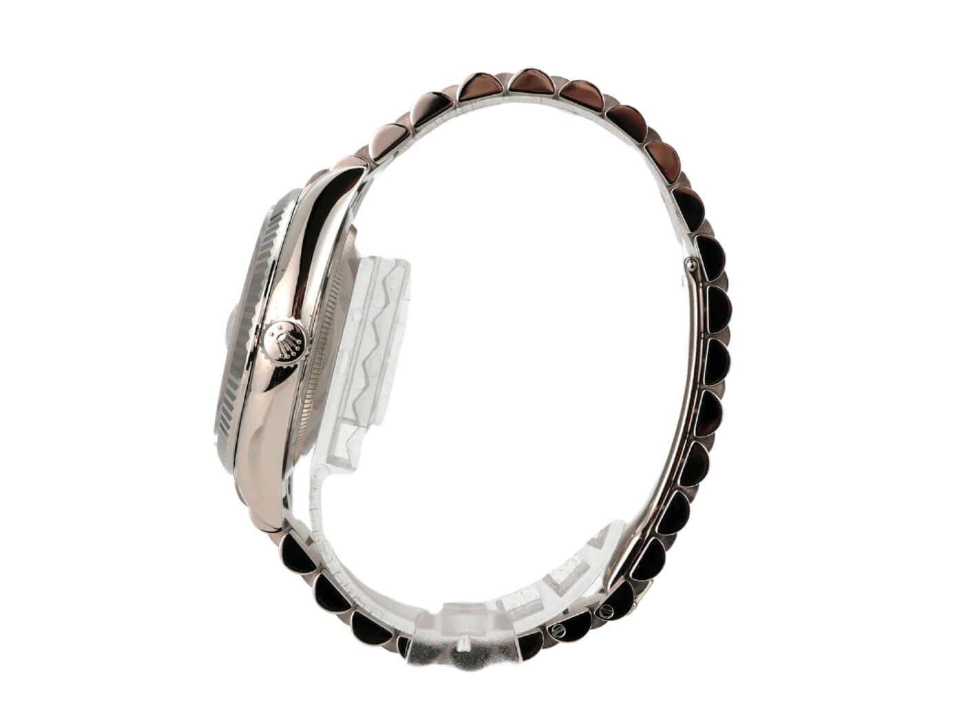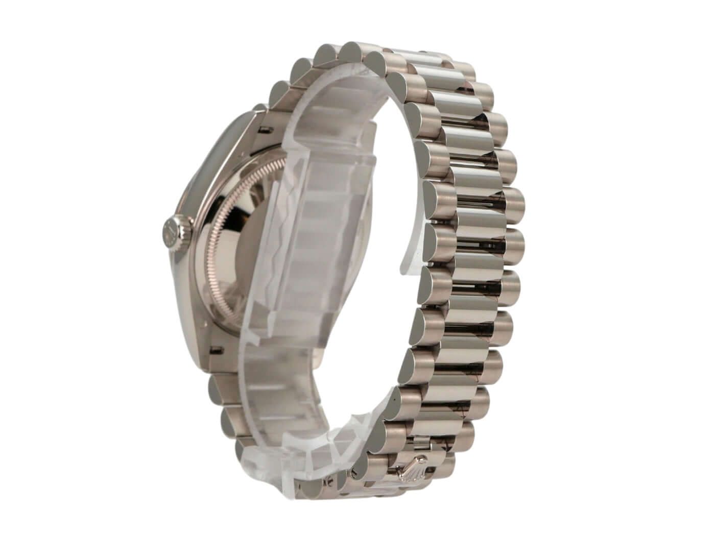Rolex Day-Date 36 White Gold Ref. 128239 White RomanCase made of 18 kt yellow gold, polished and satin-finished, case diameter 36 mm, bezel made of 18 kt white gold with fluted design, President bracelet made of 18 kt white gold, polished and satin-finished with folding clasp, white dial with Roman numerals, luminous hands, automatic movement, Rolex manufacture caliber 3255 with 31 jewels, frequency 28,800 A/h, 70 hours power reserve, date display with cyclops lens at 3 o'clock, day display at 12 o'clock, chronometer, scratch-resistant sapphire crystal, screw-down crown, screw-down case back made of 18 kt white gold, water-resistant up to 10 bar.Used watch, very good condition, complete with box and papers, delivered in 2022.