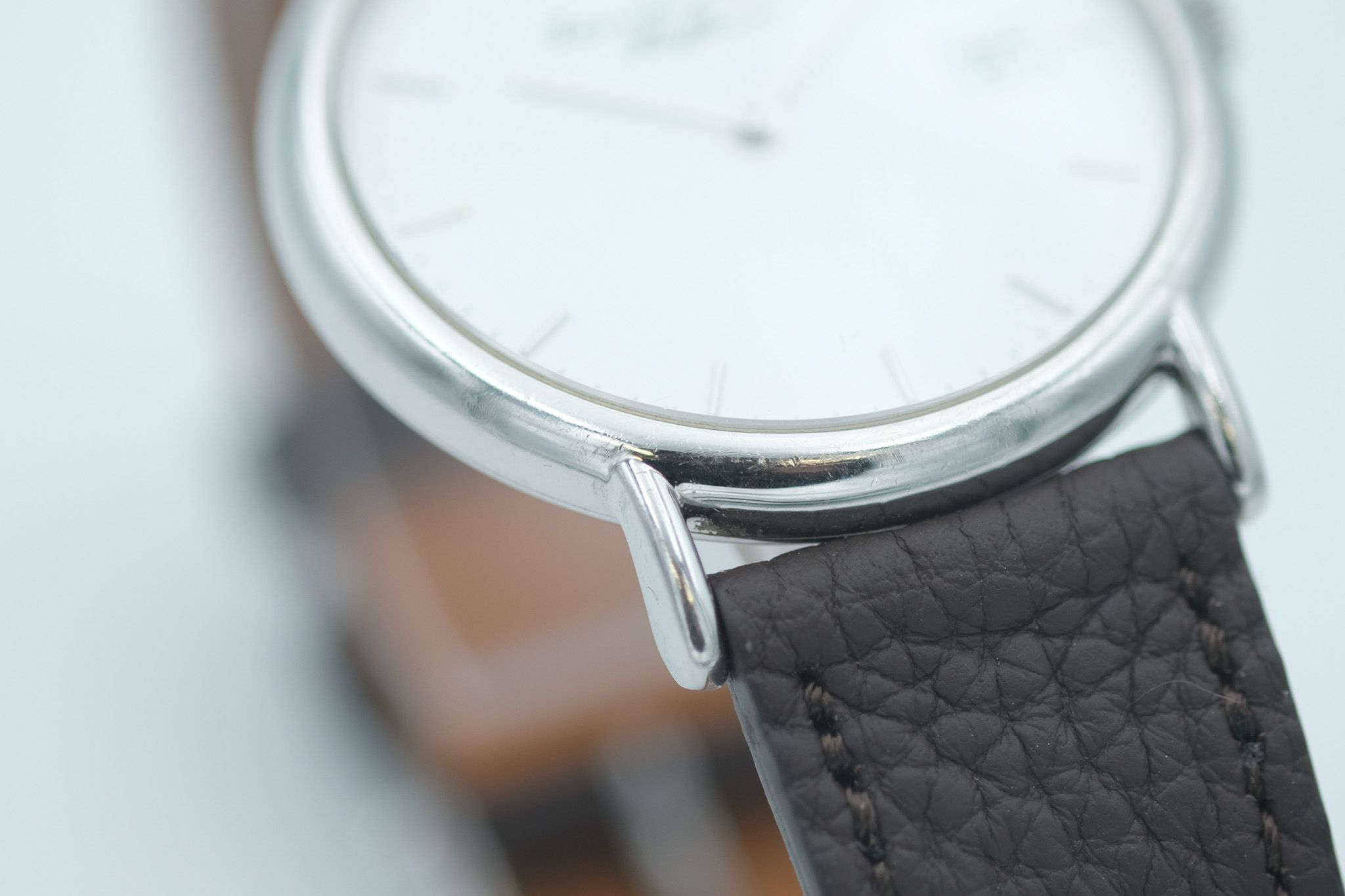 Beautiful, simple 34 mm Portofino with quartz movement, white dial, and steel case.The steel case is in good condition with signs of wear. There are no deep scratches or dents. The dial and hands are in very good condition.