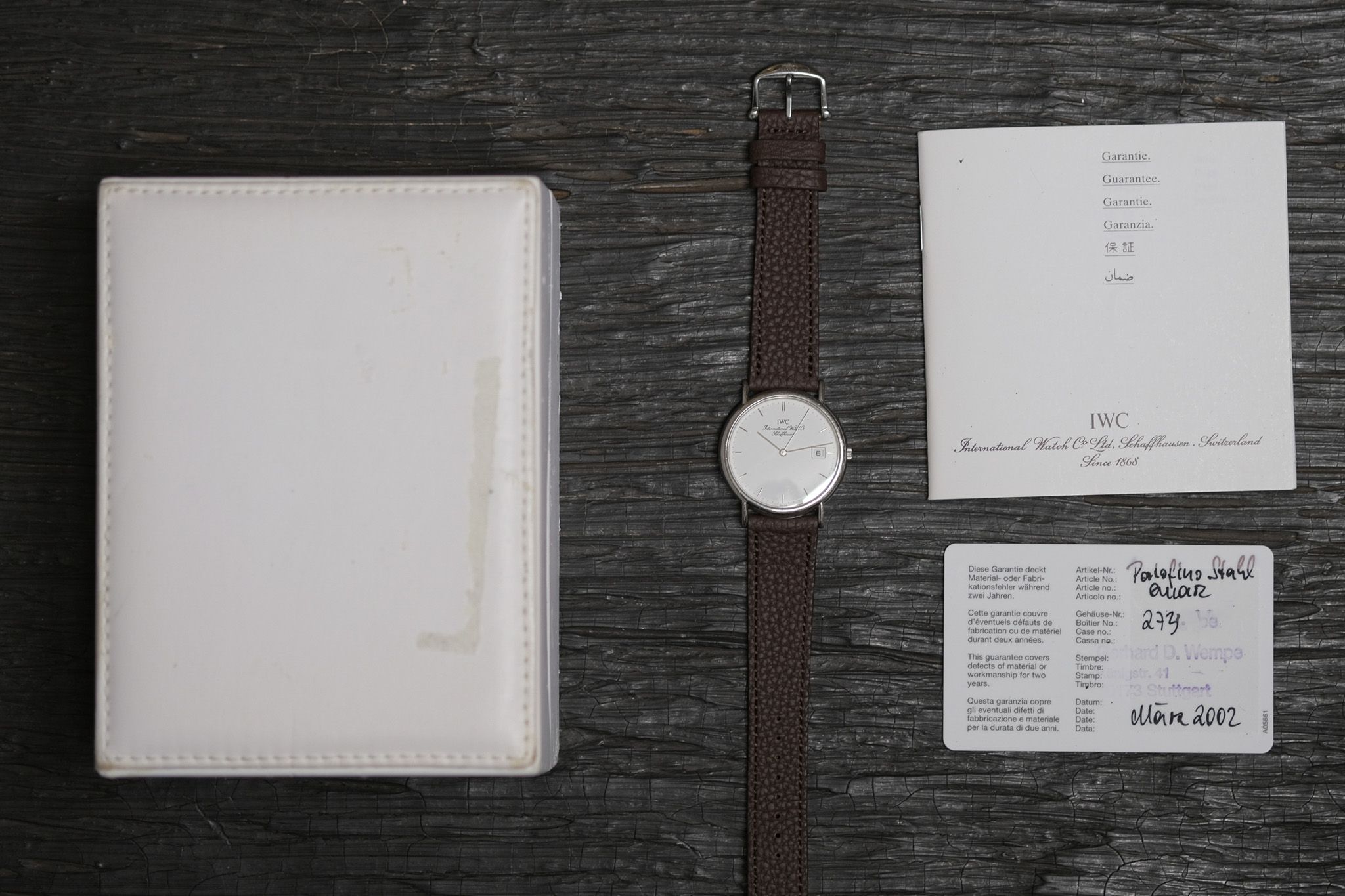 Se incluyen la caja y los documentos originales. La hebilla de pin original de IWC está adjunta. El reloj fue comprado a un distribuidor alemán en 2002.