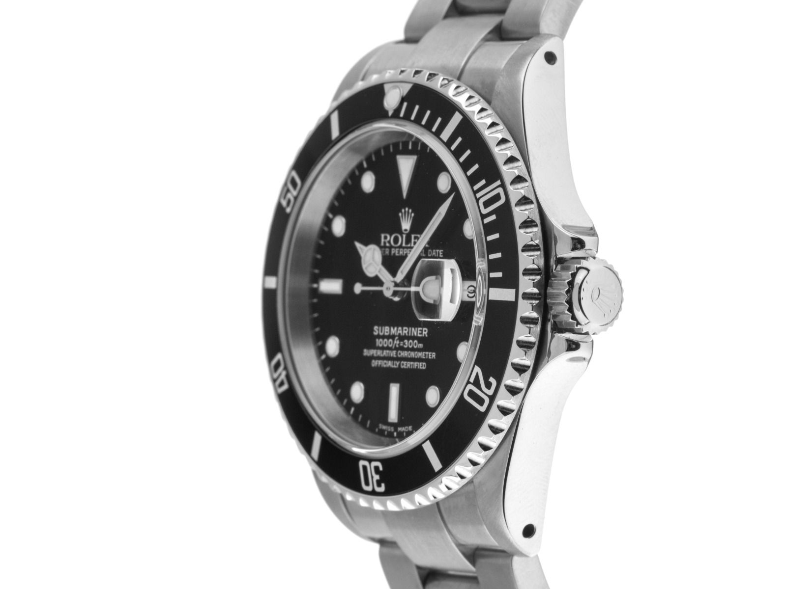 Rolex Submariner Date Stahl Automatik Armband OysterGehäuse Edelstahl poliert und satiniert, Gehäusedurchmesser ohne Krone 40mm, Gehäusehöhe 12,8mm. Lünette Edelstahl gerädelt mit schwarzem Inlay und 60-Minuten Skala, Flat 4, einseitig drehbar. Armband Oyster Edelstahl satiniert, Sicherheitsfaltschließe Edelstahl mit Hersteller-Logo. Zifferblatt schwarz mit aufgesetzten weißgoldenen Indexen und weißgoldenen Zeigern. Uhrwerk Automatik, Rolex Manufakturkaliber 3135 mit 31 Edelsteinen. Anzeige von Stunde, Minute und Sekunde über Zeiger aus der Mitte mit Sekundenstopp zur sekundengenauen Einstellung der Uhrzeit, Datumsanzeige mit Schnellverstellung unter Glaslupe bei 3 Uhr. Saphirglas kratzfest. Krone verschraubbar mit Flankenschutz und Hersteller-Logo. Boden Edelstahl verschraubt. Gewicht der Uhr inklusive Armband 131g, Länge des Armbandes inklusive Gehäuse 175mm. Referenznummer: 16610, Gehäusenummer: K3535XXX, Baujahr: 2001, ID: KA1721169481125H-12500, Artikelnummer: 10000083031. Mit Gangkontrolle und kompletter äußerlicher Aufarbeitung von November 2025. Original Rolex Box mit Umkarton sowie Beschreibung, Ledermäppchen, Übersetzungsheft, Rolex Chronometer-Siegel und Watchregister Auszug von November 2025, The Watch Register Zertifikat / ohne Eintrag (Internationale Datenbank für verlorene oder gestohlene Uhren). Superschnäppchen, Kapitalanlage mit Wertsteigerungspotential, sehr seltenes Sammlerstück. Wie Neu. Lieferzeit sofort.