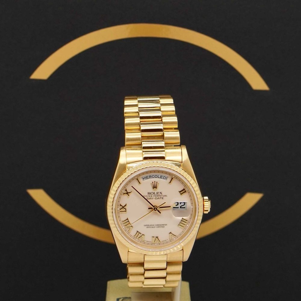 Rolex Day-Date 36 18238 with Box & Papers from 1992. Very good condition. Every watch is checked on authenticity by our master watchmakers. With every sale an authenticity certificate is given. On every watch there is a warranty of 12 months on the watch and movement. Although it is rarely used since watches are maintained and - if neccesary - serviced before being sold.
