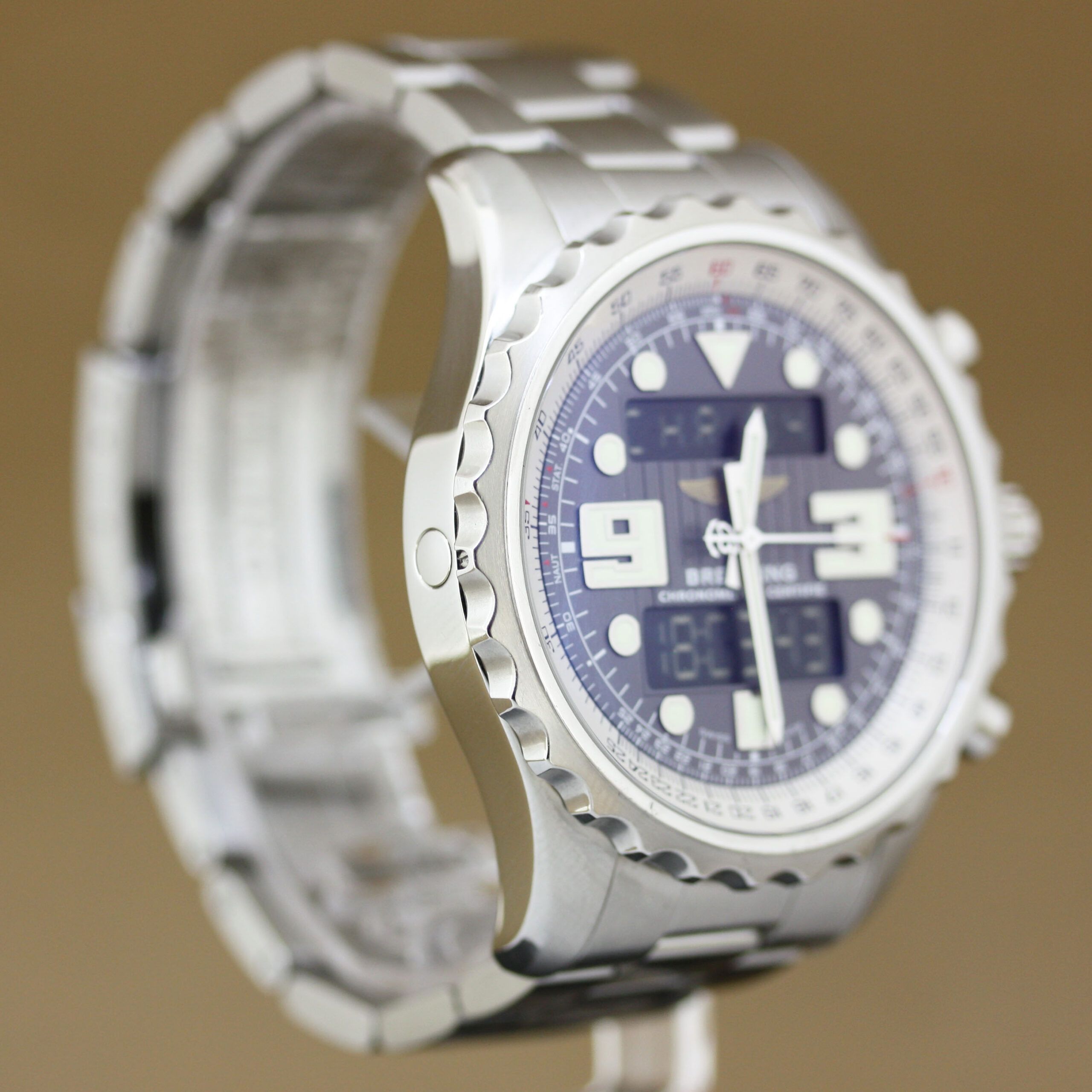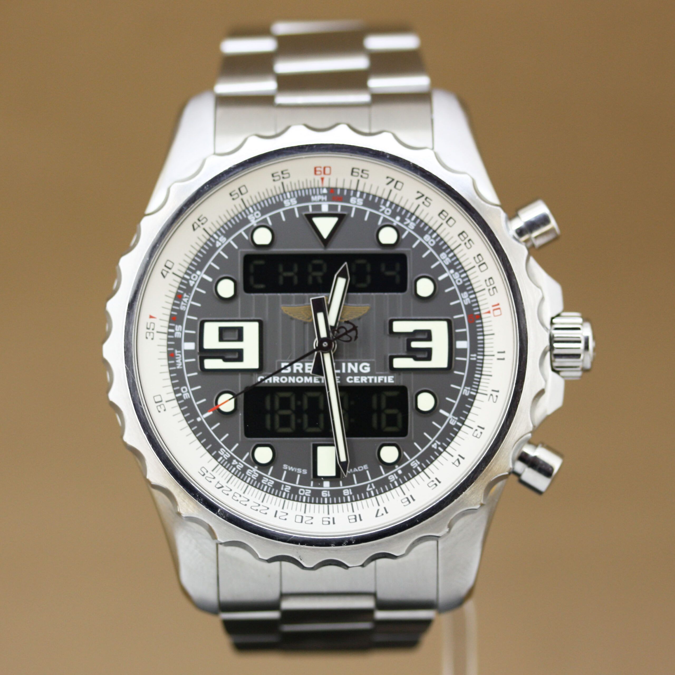 Breitling Chronospace – Ref. A78365 For sale: a Breitling Chronospace in very good condition.This robust and versatile model features a stainless steel case and a grey dial. The stainless steel bracelet with folding clasp ensures both security and sporty elegance. Inside ticks an advanced Quartz multifunction movement offering:✔ Chronograph (accuracy to 1/100 sec.)✔ Alarm function✔ Dual time (second time zone)✔ Digital time display✔ Backlight for excellent legibility Features & Scope of Delivery:✔ Reference: A78365✔ Case: Stainless steel✔ Dial: Grey✔ Bracelet: Stainless steel bracelet with folding clasp✔ Movement: Quartz multifunction (chronograph, alarm, dual time, digital display, backlight)✔ Diameter: 48 mm – bold and robust size✔ Condition: Very good✔ Breitling travel case included✔ Certificate of authenticity & valuation report present❌ No original papers available A versatile Breitling Chronospace that perfectly combines strength, precision, and functionality.