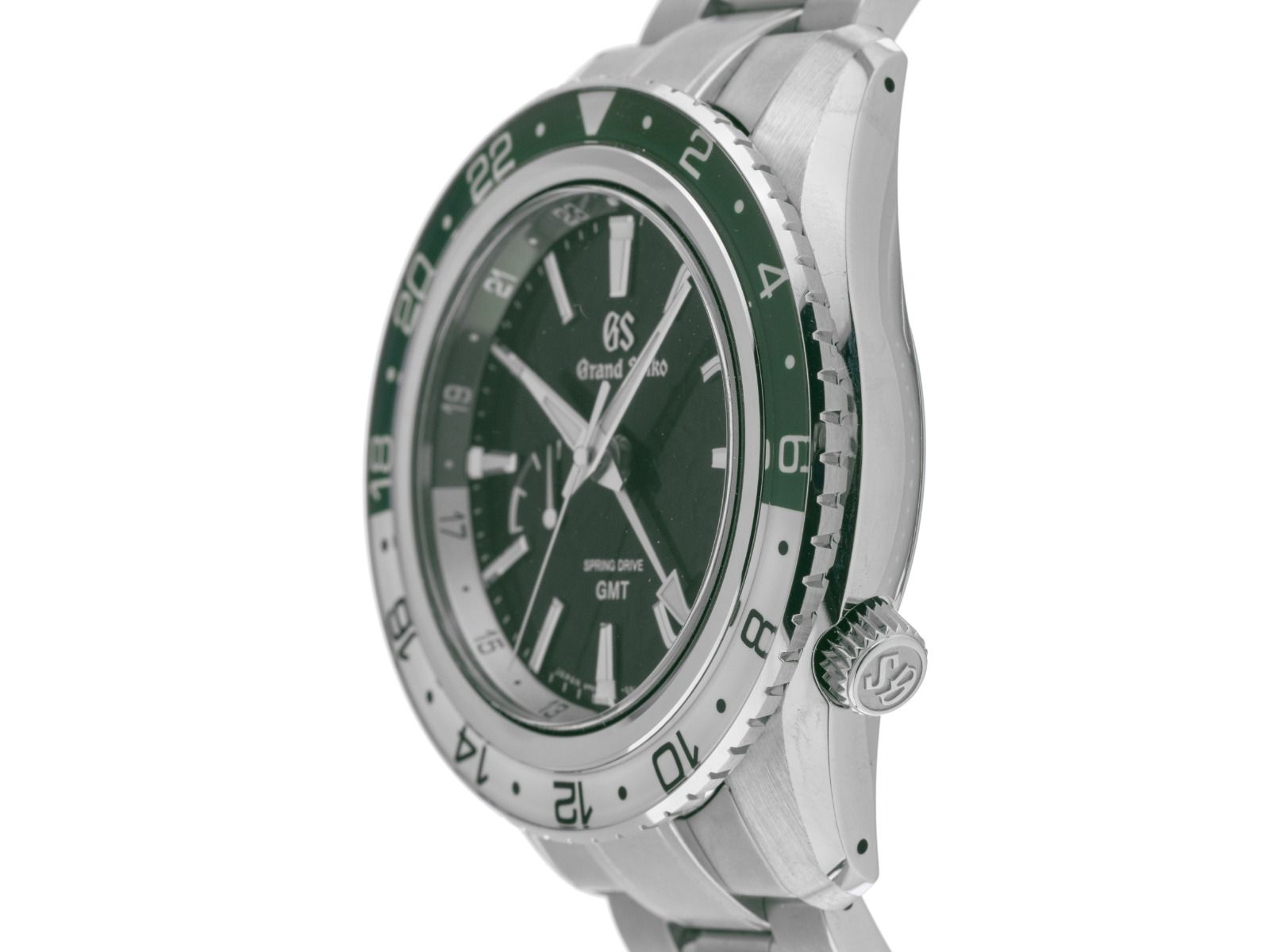 Grand Seiko Sport Kollektion Stahl Automatik Armband StahlGehäuse Edelstahl poliert und satiniert, Gehäusedurchmesser ohne Krone 44mm, Gehäusehöhe 14,6mm. Lünette Edelstahl mit grün / weißem Inlay und 24-Stunden Skala sowie Unterglas 24-Stunden Skala. Armband Edelstahl poliert und satiniert, Sicherheitsfaltschließe Edelstahl mit Hersteller-Logo. Zifferblatt grün mit aufgesetzten Edelstahl Indexen und Edelstahl Leuchtzeigern. Uhrwerk Automatik, Seiko Kaliber 9R66 mit 30 Edelsteinen, Gangreserve ca. 72 Stunden. Anzeige von Stunde, Minute und Sekunde über Zeiger aus der Mitte mit Sekundenstopp zur sekundengenauen Einstellung der Uhrzeit, Datumsanzeige mit Schnellverstellung bei 4 Uhr, GMT (zweite Zeitzone) ablesbar über weißen Zeiger aus der Mitte, Gangreserveanzeige zwischen 8 Uhr und 9 Uhr. Saphirglas kratzfest. Krone mit Hersteller-Logo bei 4 Uhr. Boden Edelstahl verschraubt und graviert. Gewicht der Uhr inklusive Armband 184g, Länge des Armbandes inklusive Gehäuse 200mm. Wasserdicht bis 20 ATM, Referenznummer: SBGE295G, ID: ST116097461125H-7000, Artikelnummer: 10000083098. Original Grand Seiko Box mit Umkarton und Garantie Papiere von 2025 sowie Beschreibung, Full Set. Superschnäppchen. Ungetragen. Lieferzeit sofort.