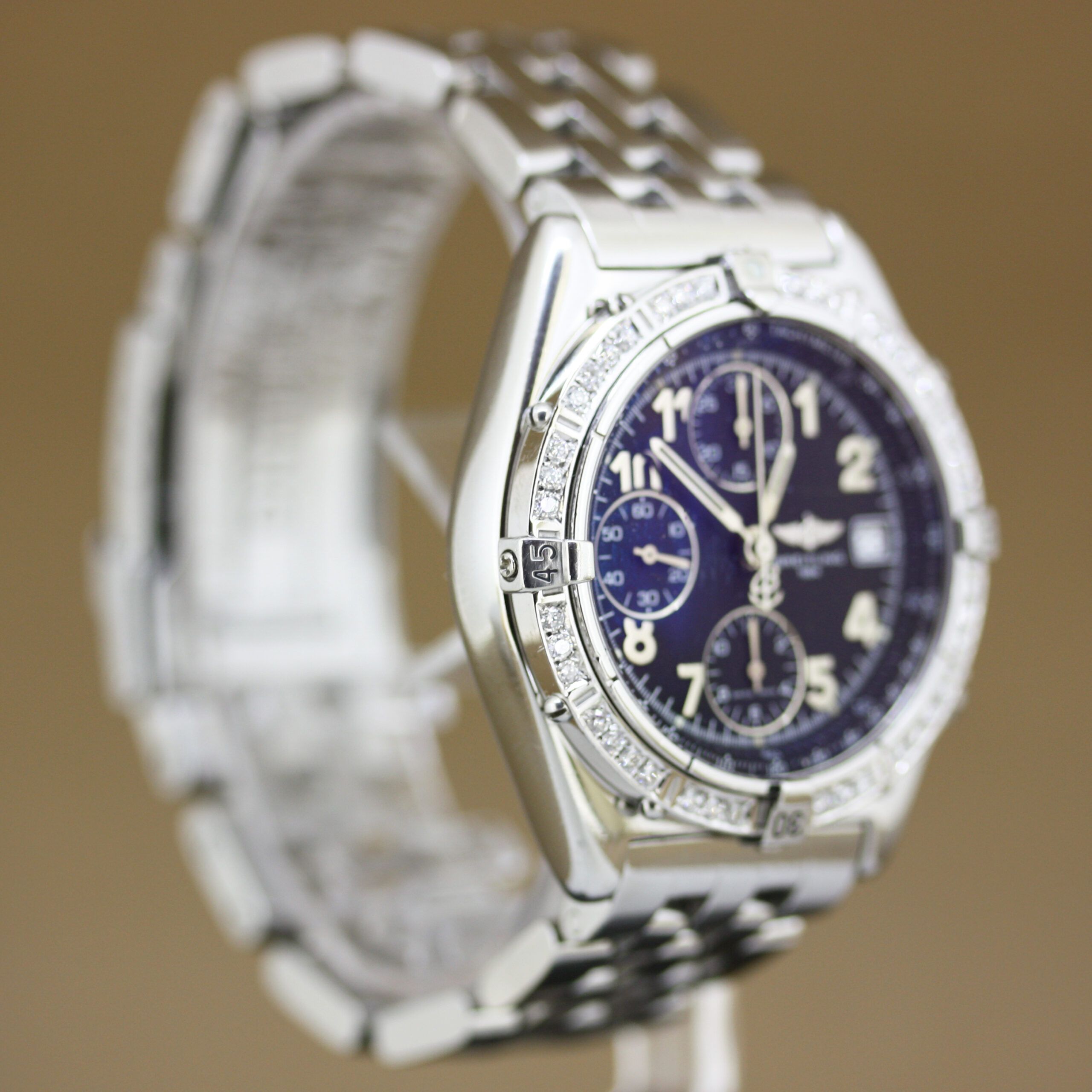 For sale: a Breitling Chronomat, reference A13050.1, in very good condition.This elegant and sporty model features a stainless-steel case and a high-quality bezel set with natural diamonds, giving the watch a luxurious and refined appearance.
