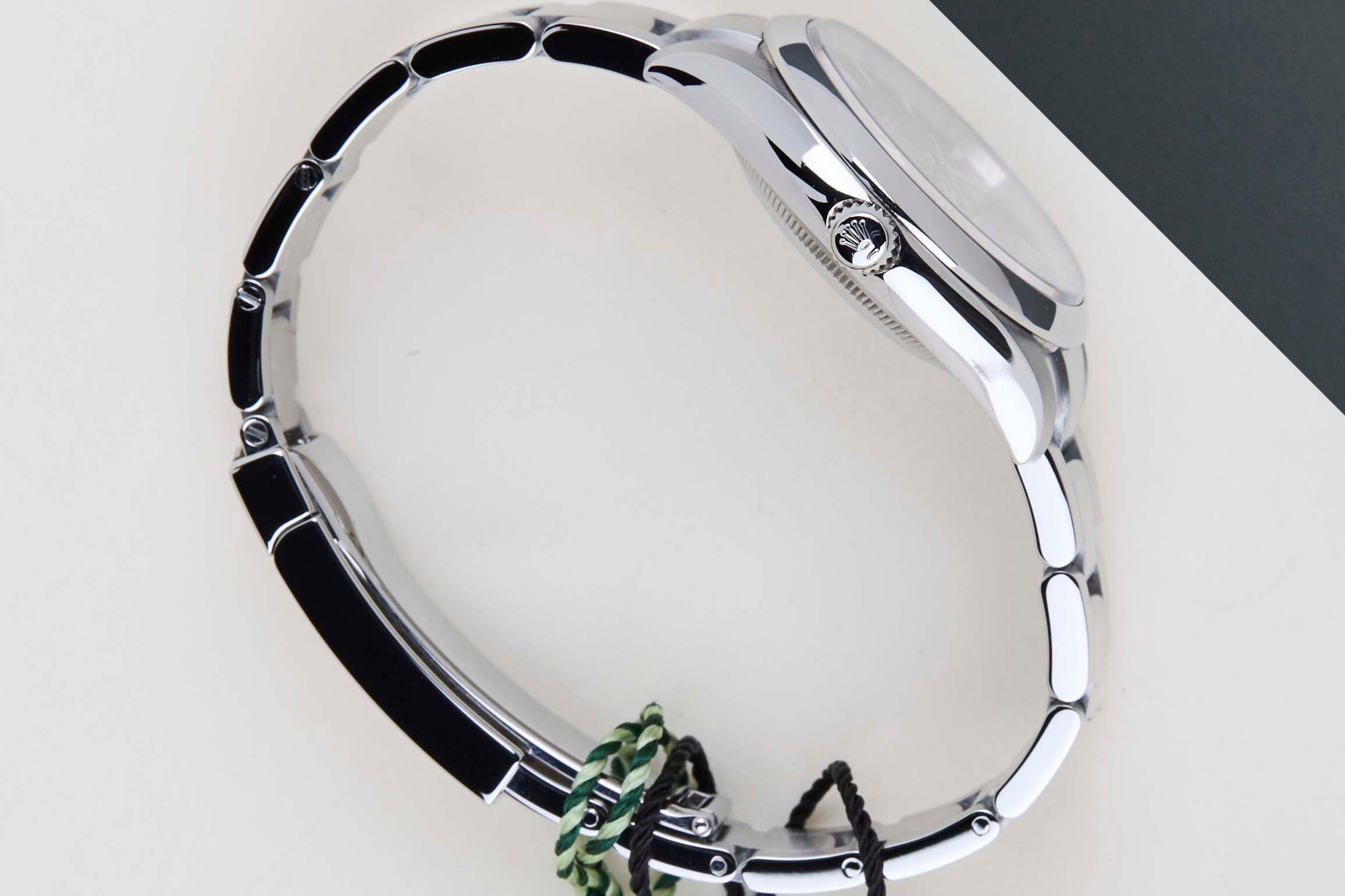 Full Set | European Rolex Warranty CardThe Rolex Oyster Perpetual was first introduced by Rolex in the 1930s. It is characterized by its water-resistant Oyster case and self-winding Perpetual movement. The Rolex Oyster Perpetual a simple, yet elegant timepiece that is suitable for both casual and formal wear.This Rolex Oyster Perpetual ‘Olive Green Dial’ was sold for the first time in September 2018.The watch is fully made out of stainless steel. Rolex uses 904L in its steel watches, which is an extremely resistant and highly polishable superalloy.This amazing Rolex Oyster Perpetual is in amazing condition and comes with the original Rolex Warranty Card and Box. Furthermore, the watch has been serviced by our watchmaker, and therefore it comes with one year of Steiner warranty.