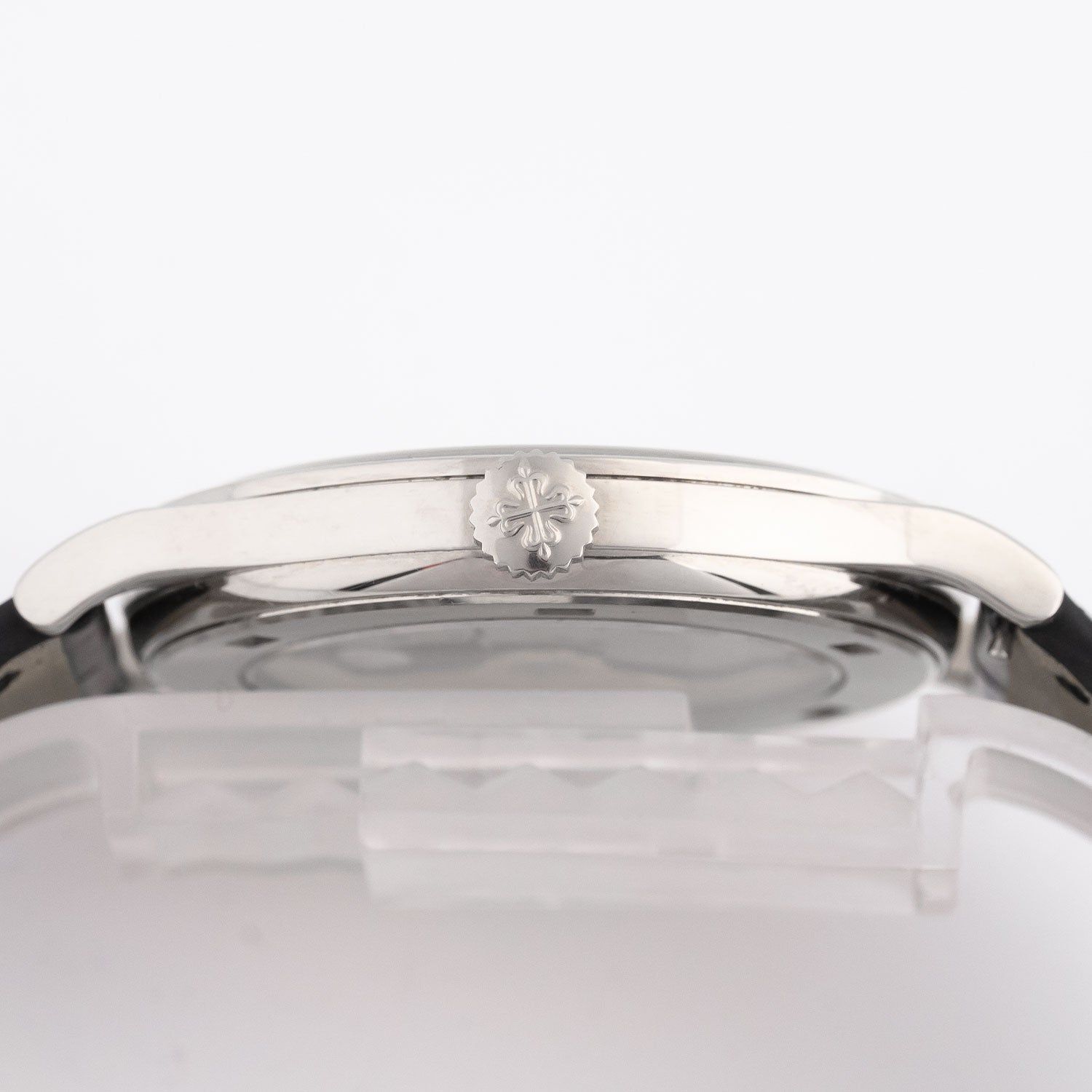 La caja de 38 mm de oro blanco de 18 quilates combina una presencia discreta con una elegancia excepcional. Sus líneas limpias, los esbeltas garras de la correa y la superficie pulida son características del icónico diseño Calatrava. La esfera en color plata opalina con índices de oro blanco facetados y agujas Dauphine sencillas proporciona una apariencia armoniosa y perfectamente equilibrada. A las 6 en punto, hay un sutil indicador de segundos en el subdial, que subraya el carácter clásico del modelo.