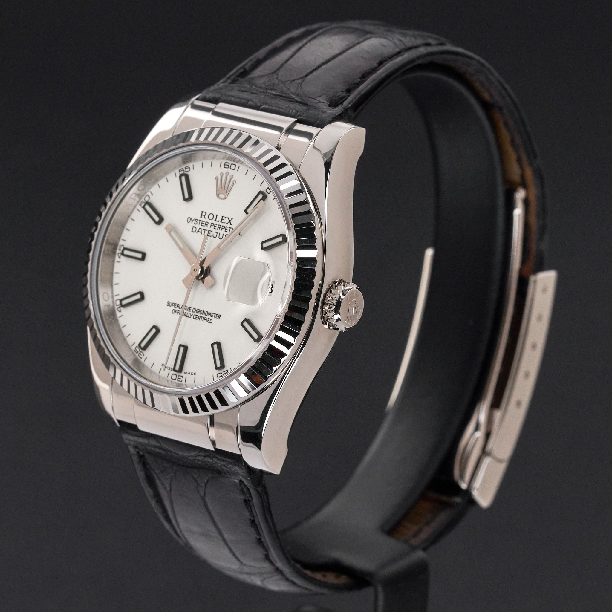 This Rolex Datejust 116139 features a White dial and is crafted from 18K white gold, with a production year of 2001.Case No: F69XXXX