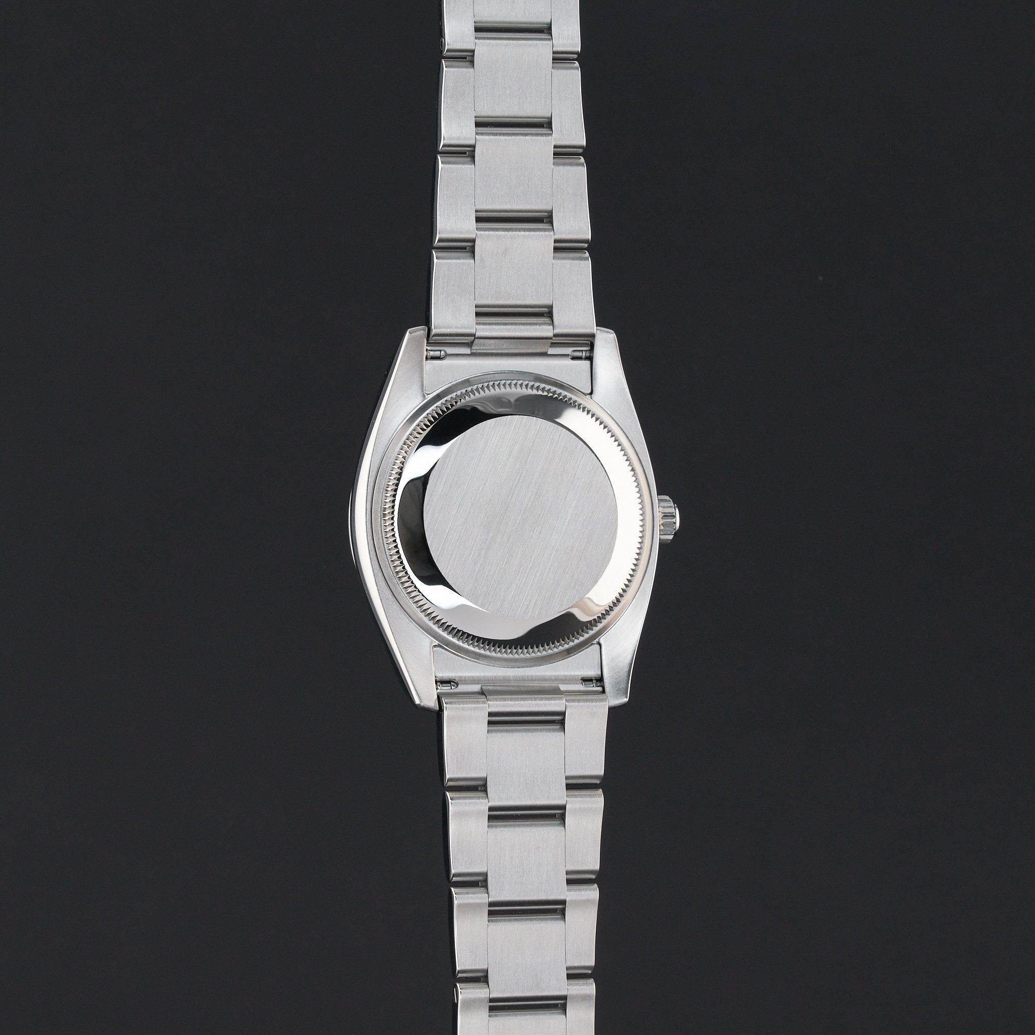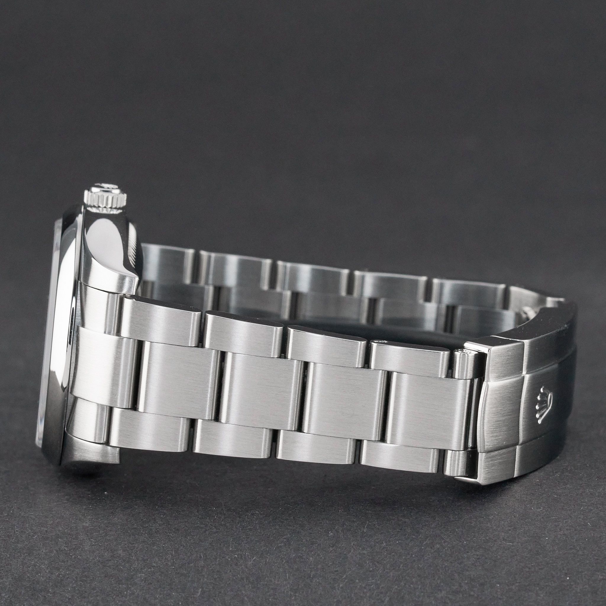 Este Rolex Oyster Perpetual 114200 cuenta con una esfera color oliva y está fabricado en acero inoxidable, con un año de producción de 2017.