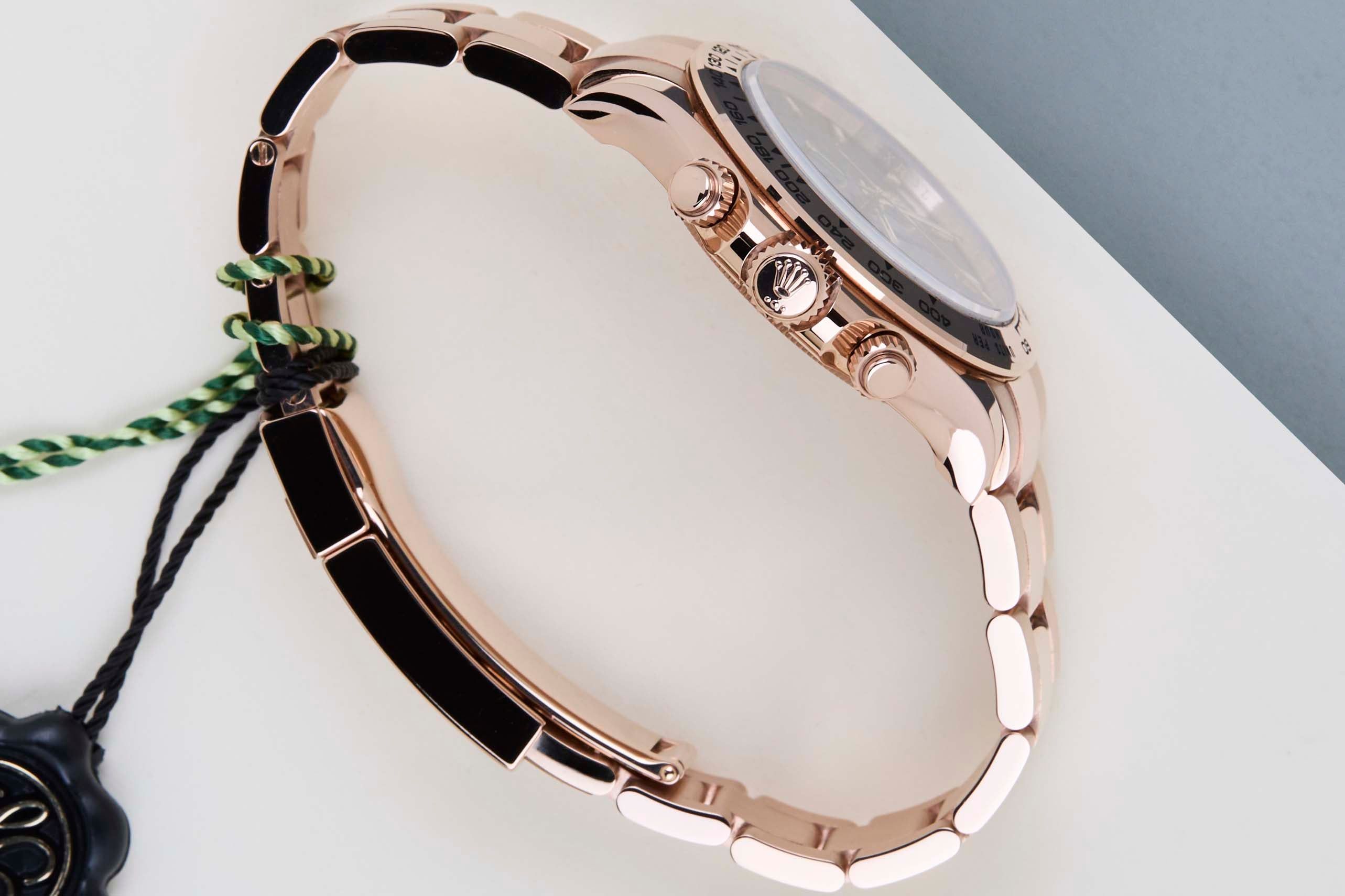 99% New Condition | Unpolished | Full-Set | Rolex Warranty until January 2028 | Including Original European Rolex Authorized Dealer Receipt The Rolex Cosmograph Daytona is considered one of the most popular models in the world. The reasons for this vary from the watch's history in timekeeping, racing and the love it evoked amongst timepiece enthusiasts, to the huge demand for both the current and the vintage references.This highly-sought after Rolex Daytona consists out of 18k Everose Gold which includes the case, the bracelet, hour markers and hands. This specific 116505 is featured with a Chocolate dial. It is fitted with Chromalight which can be recognised by the blue coloured lume.This Daytona is fitted with the 4130 calibre, which was the first generation with an in-house movement by Rolex.This exceptional Rolex Daytona is in Mint condition and comes with the original Rolex Warranty Card and Box. Furthermore, the watch still has Worldwide Rolex Warranty until January 2028.