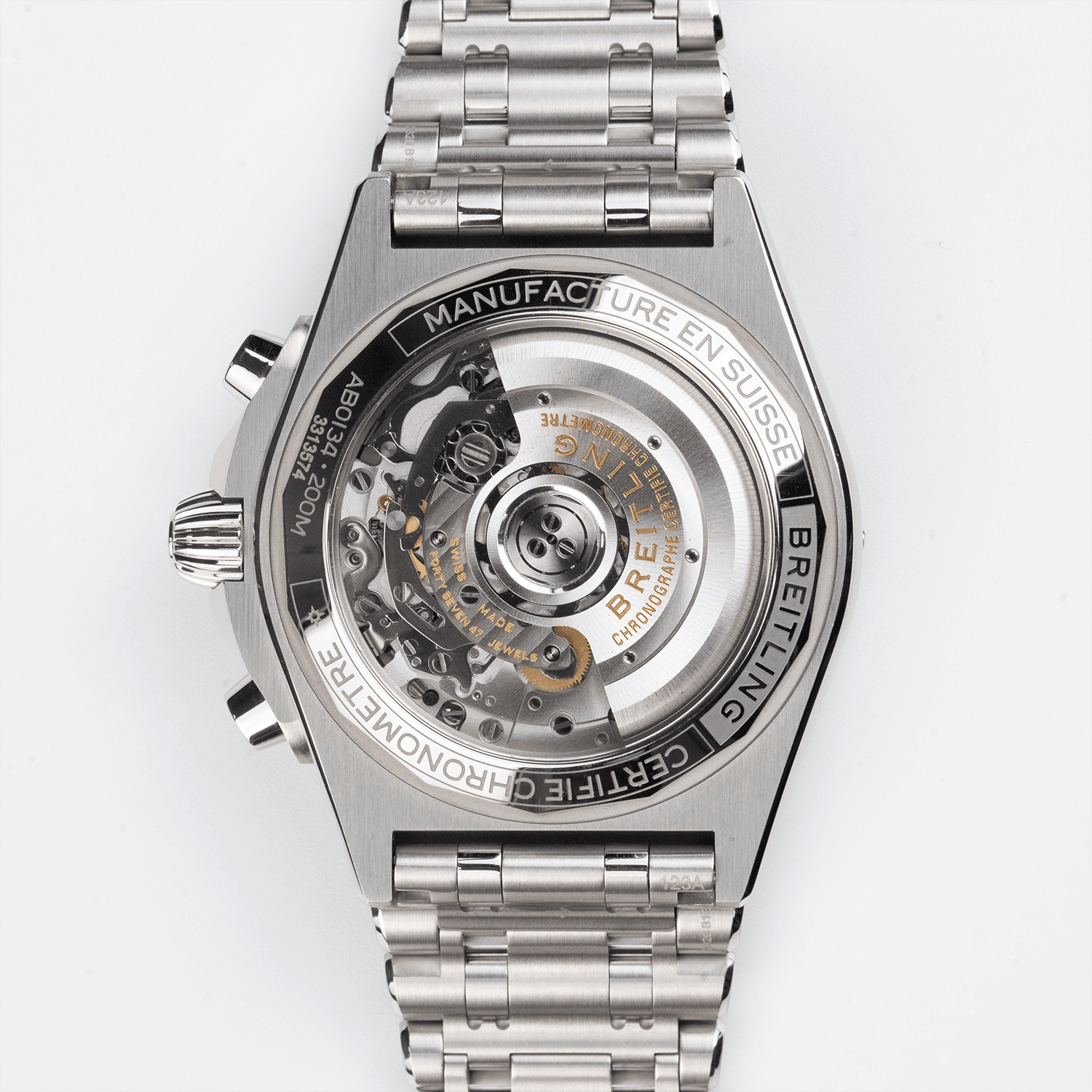 ¿La esfera más bonita para el Breitling Chronomat? Posible - Este modelo es, sin duda, icónico. Nuestro reloj viene con la atemporal correa Rouleaux y como cronógrafo. Con 42 mm, es un tamaño óptimo para la mayoría, y el fondo de cristal permite ver el hermoso movimiento de manufactura.