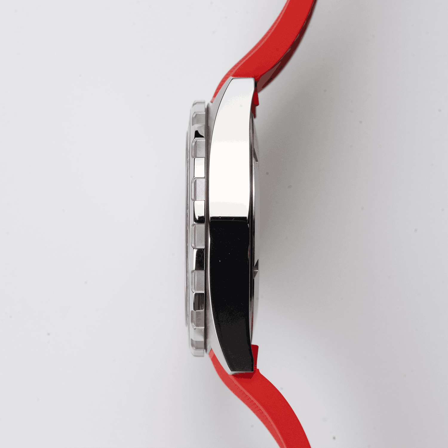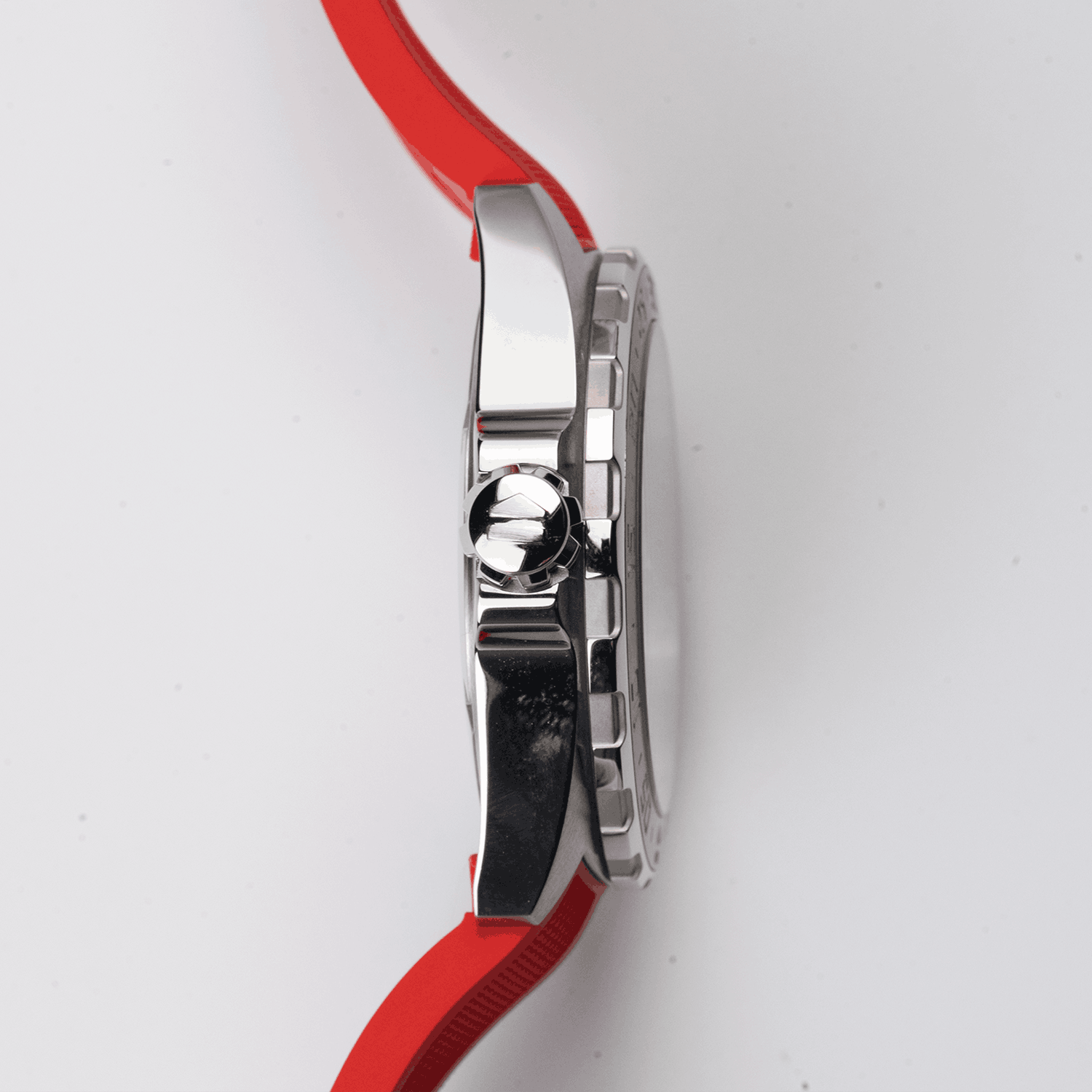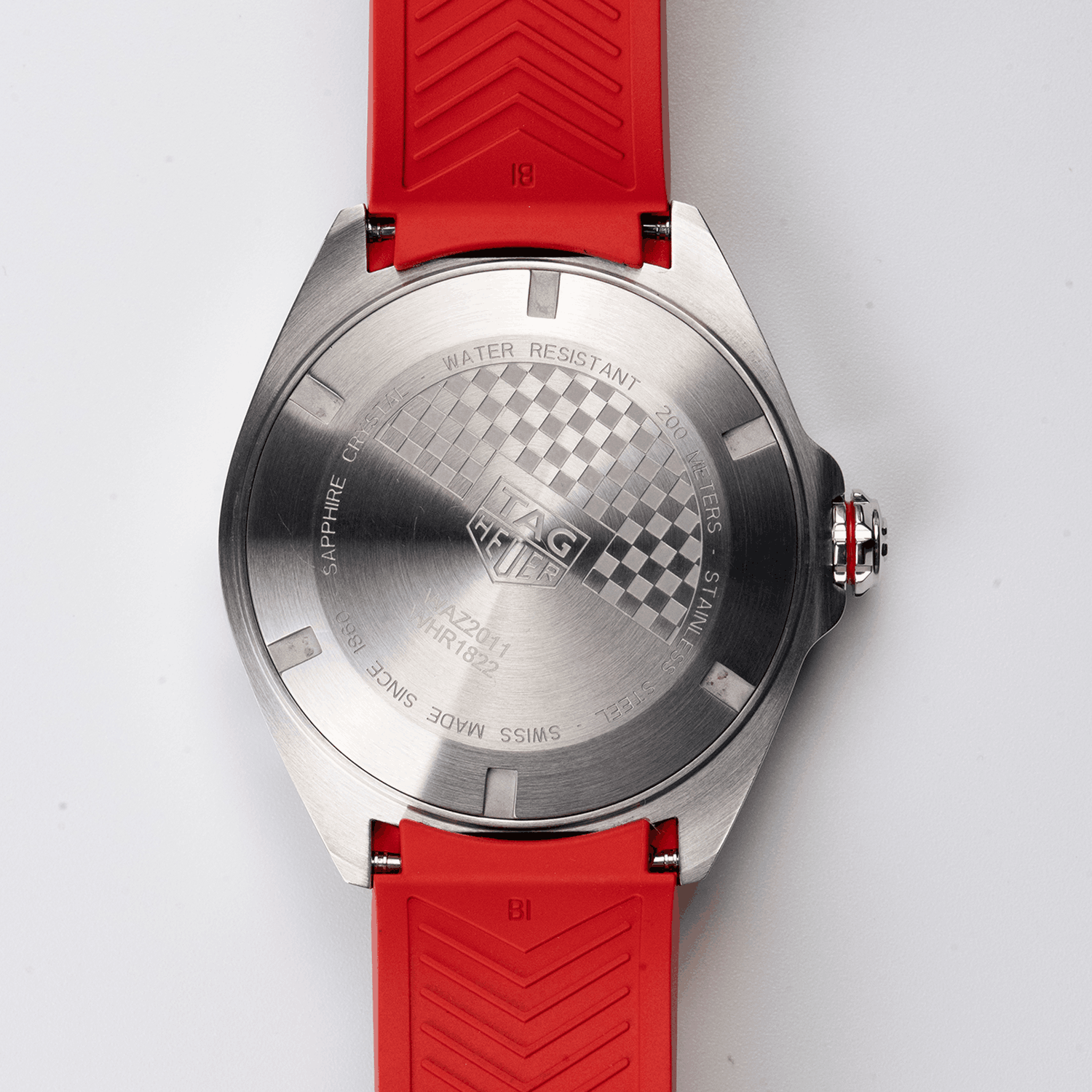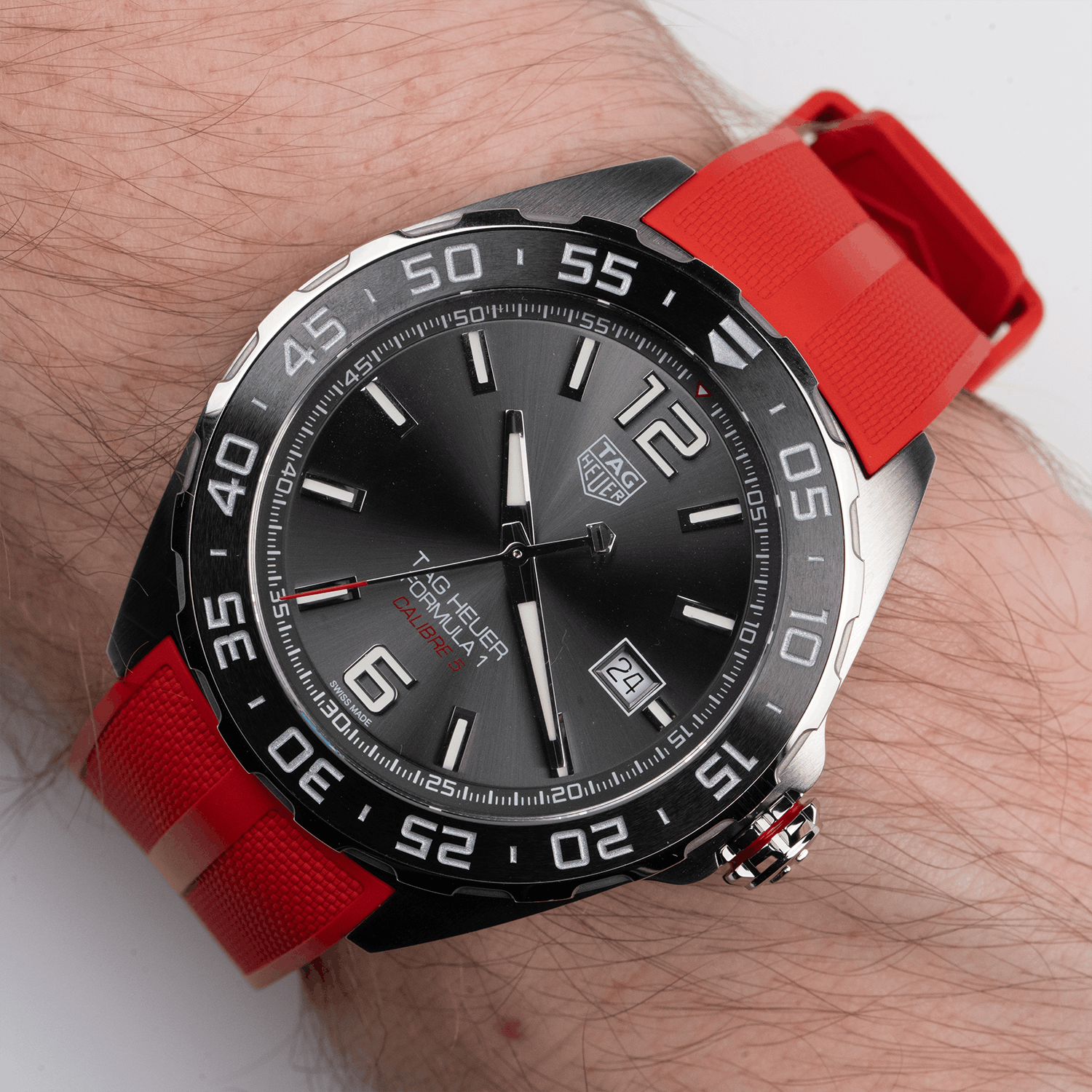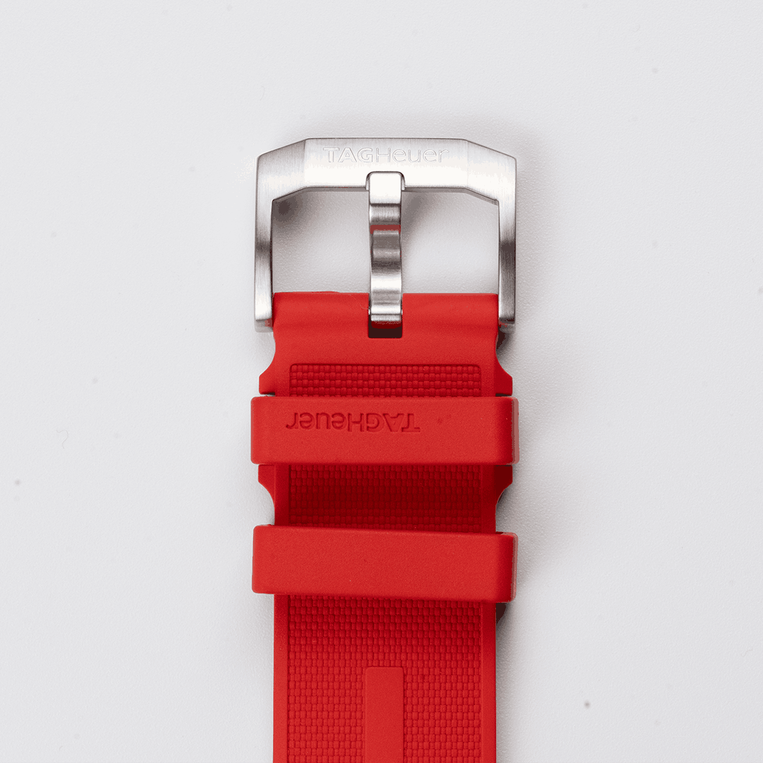 A diferencia de la mayoría de los modelos de Formula 1, este Calibre 5 viene con una correa de caucho de Tag Heuer que combina perfectamente con los detalles rojos. No solo para los fans de la Fórmula 1, este reloj es una verdadera ganga: la reloj perfecta para cualquiera que esté cansado de las aburridas pulseras de acero. Además, su peso es ahora mucho más agradable y es perfecto también para actividades deportivas.