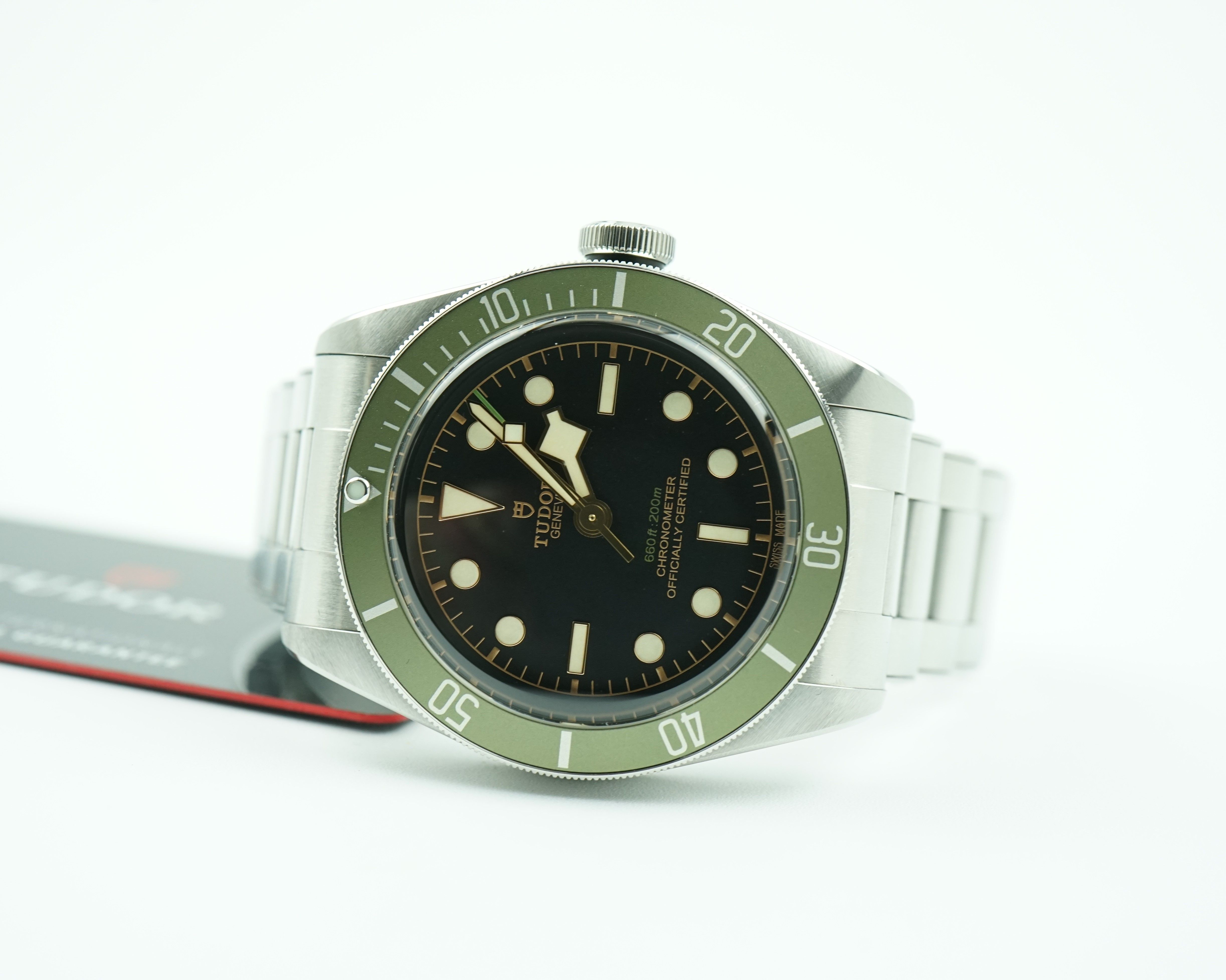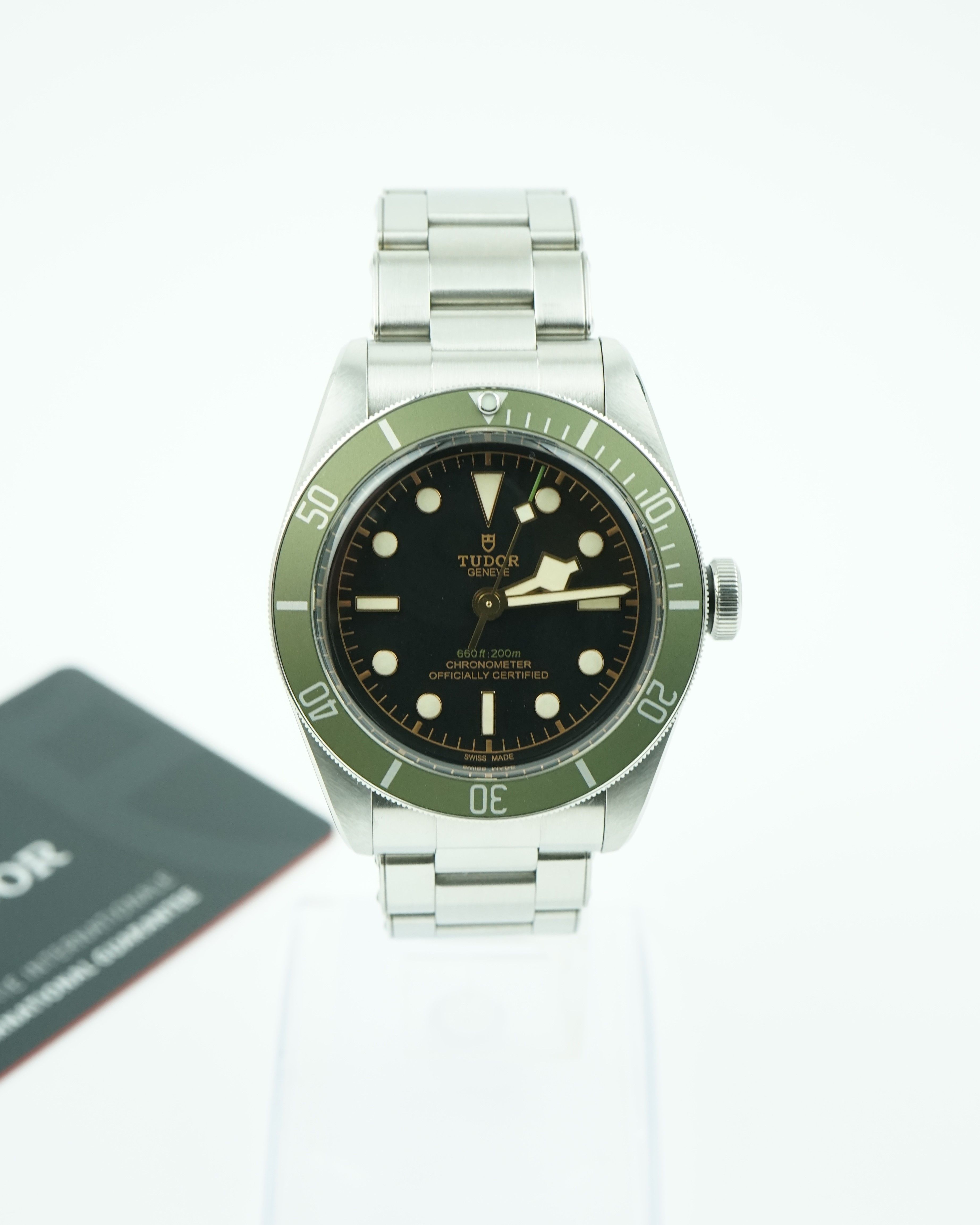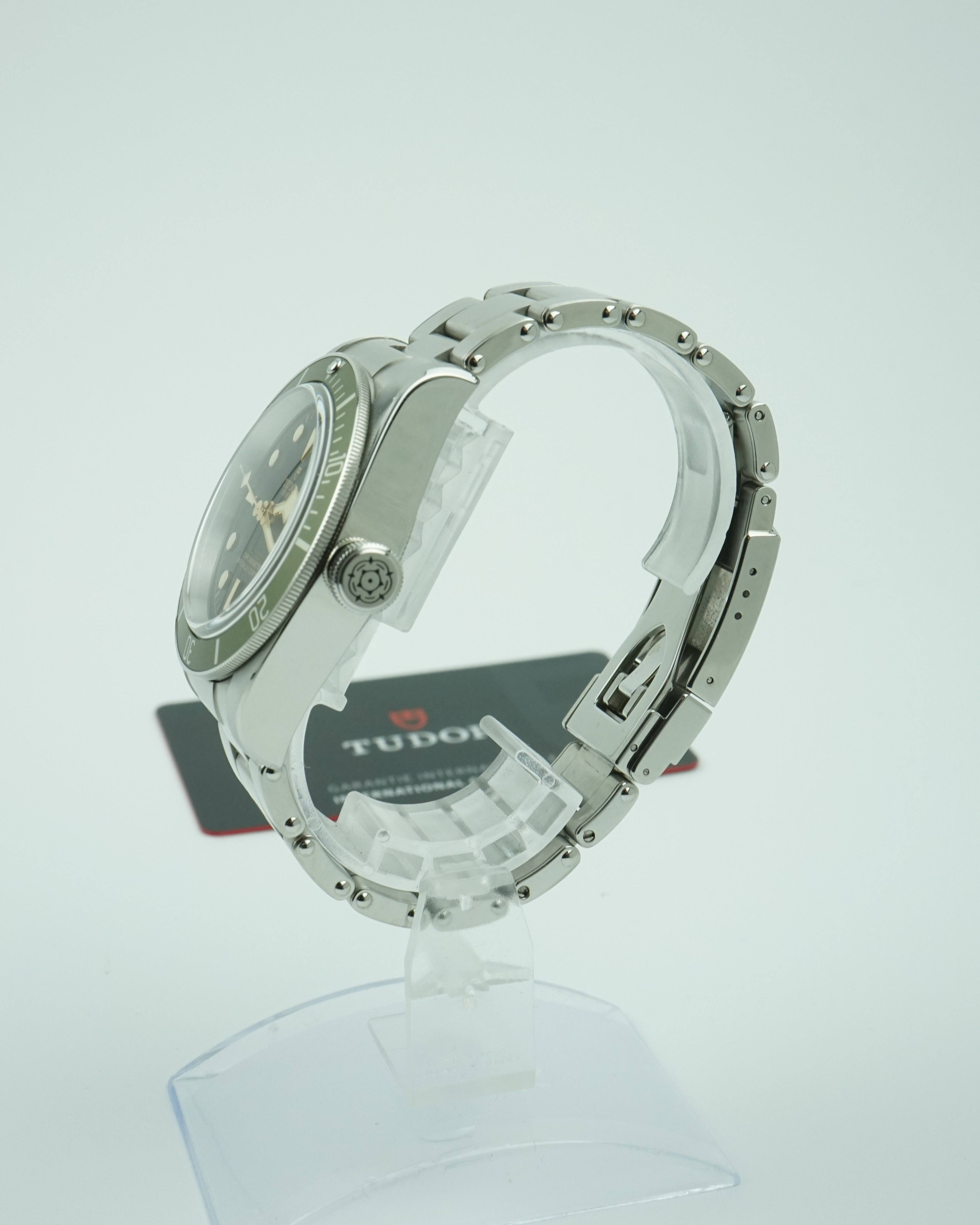 Nosotros en G-Watches estamos emocionados de presentarles un hermoso Tudor Black Bay "Harrods". Esta versión especial de la legendaria línea Black Bay destaca por su esfera negra profunda combinada con el distintivo bisel verde, un diseño creado especialmente para el renombrado almacén londinense Harrods.