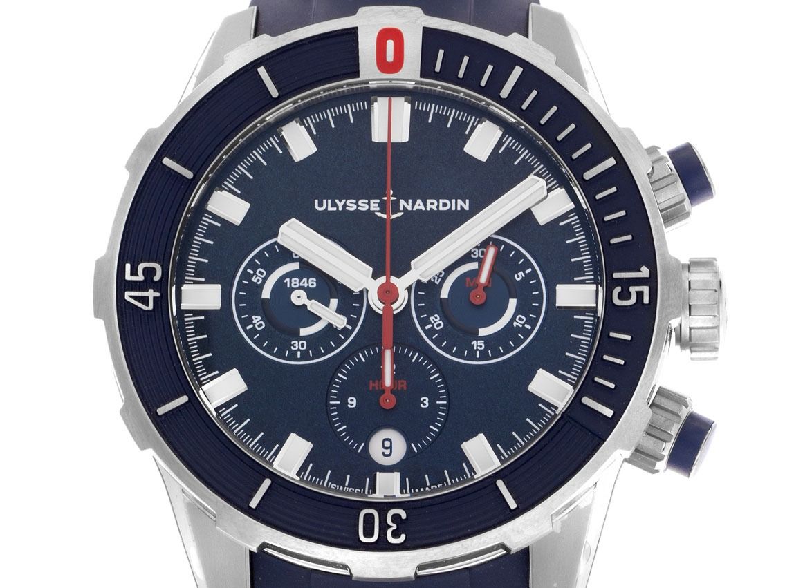 Ulysse Nardin Diver Stahl Automatik Chronograph Armband KautschukGehäuse Titan poliert und satiniert, Gehäusedurchmesser ohne Krone 44mm, Gehäusehöhe 16,2mm. Lünette Titan poliert und satiniert mit blauem Inlay, 60-Minuten Skala, einseitig drehbar. Armband Kautschuk dunkelblau mit einem Titanelement, Anstoßbreite 22mm, Stiftschließe Titan mit Hersteller-Logo. Zifferblatt blau mit aufgesetzten Edelstahl Leuchtindexen und Edelstahl Leuchtzeigern. Uhrwerk Automatik, Ulysse Nardin Manufakturkaliber UN-150 mit 25 Edelsteinen, Gangreserve ca. 48 Stunden, Silizium Hemmung. Anzeige von Stunde und Minute über Zeiger aus der Mitte, kleine Sekunde mit Sekundenstopp zur sekundengenauen Einstellung der Uhrzeit bei 9 Uhr, Datumsanzeige mit Schnellverstellung unter Glaslupe bei 6 Uhr. Saphirglas kratzfest. Krone Titan verschraubbar mit Hersteller-Logo, Chronographendrücker verschraubbar. Boden Titan 6-fach verschraubt und graviert mit Saphirglas Sichtfenster. Gewicht der Uhr inklusive Armband 107g. Wasserdicht bis 30 ATM. Referenznummer: 1503-170-3/93, ID: ST1160181901125H-13770, Artikelnummer: 10000083249. Original Ulysse Nardin Box mit Umkarton und Garantie Papiere von Oktober 2025 sowie Beschreibung, Full Set. Ungetragen. Lieferzeit sofort.