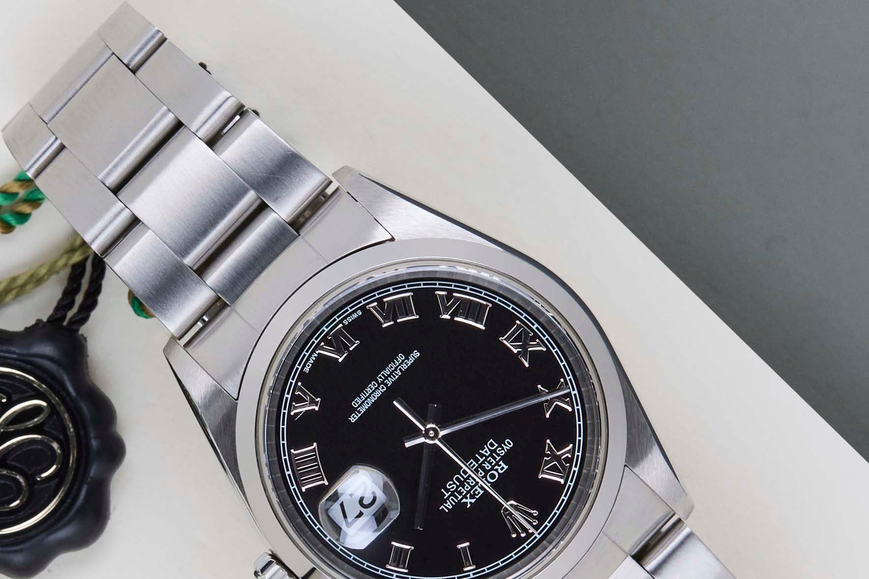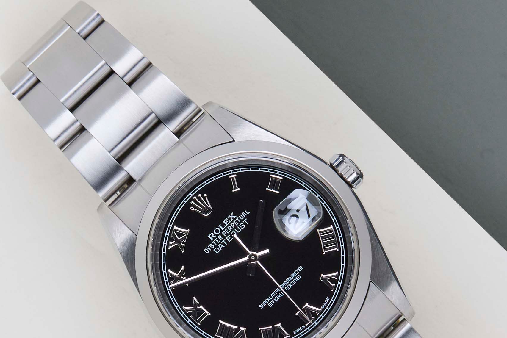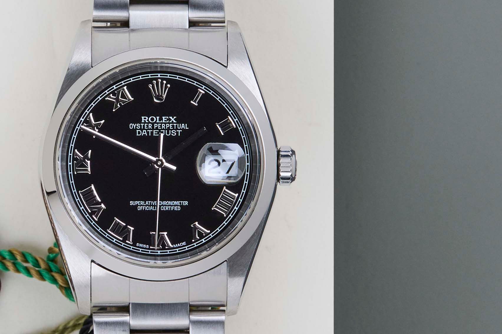 Full Set | Including Rolex Papers from October 2003Rolex introduced the original Datejust in 1945 to celebrate the company's 40th anniversary. Due to the various case sizes and materials, the Datejust has been ingrained in Rolex's history and remains incredibly popular for 75 years.This Rolex Datejust 36 'Black Roman Dial - Oyster Bracelet' was sold for the first time October 2003.This Rolex Datejust 36 is in Mint condition and comes with the original Rolex Warranty Card and Box. Furthermore, the watch has been serviced by our watchmaker, and therefore it comes with one year of Steiner warranty.