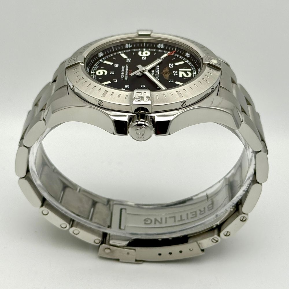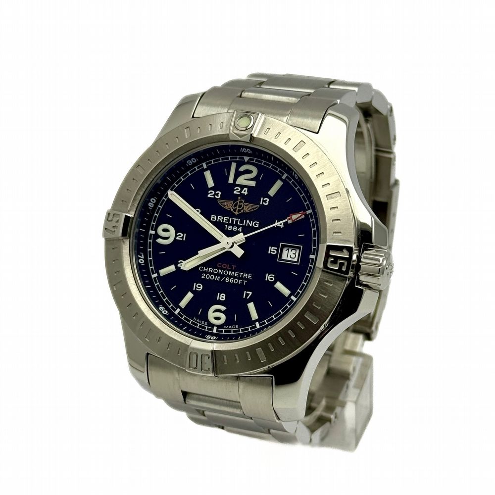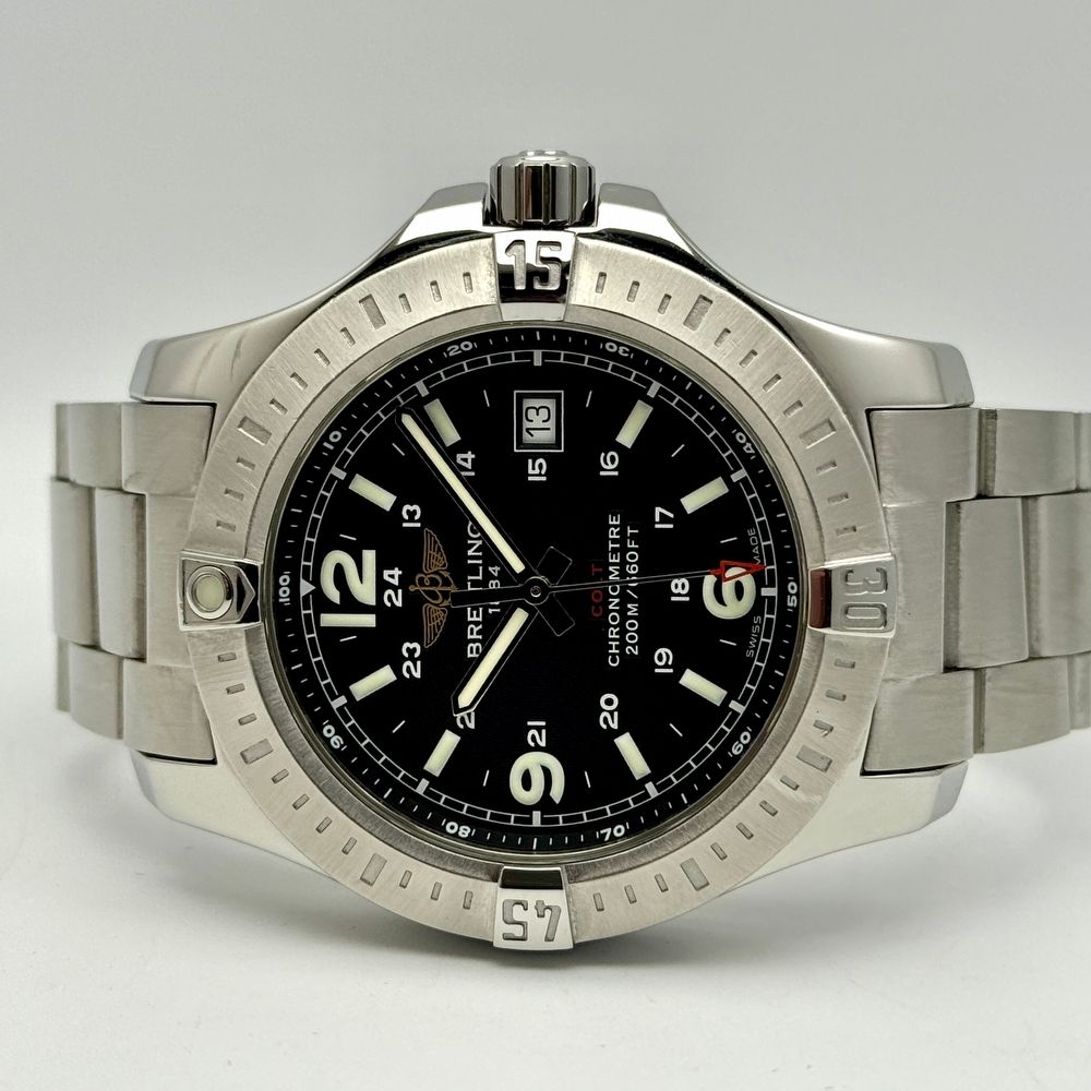 Founded in 1884 in Saint-Imier, Switzerland, Breitling has long been recognized for producing high-precision instruments designed for professionals. The Colt collection reflects this heritage, delivering durability, functionality, and the bold design language characteristic of Breitling tool watches.The Breitling Colt 44, reference A7438811/BD45, features a 44 mm stainless steel case with a black dial, luminous hour markers, and the distinctive stencil-style numerals at 6, 9, and 12 o’clock. The red-tipped seconds hand and polished bezel rider tabs add subtle sporty contrast. Powered by the Breitling caliber 74 SuperQuartz™ movement, it offers accuracy ten times greater than standard quartz watches. Functions include hours, minutes, seconds, and a date display at 3 o’clock, with COSC certification ensuring chronometer-level precision.
