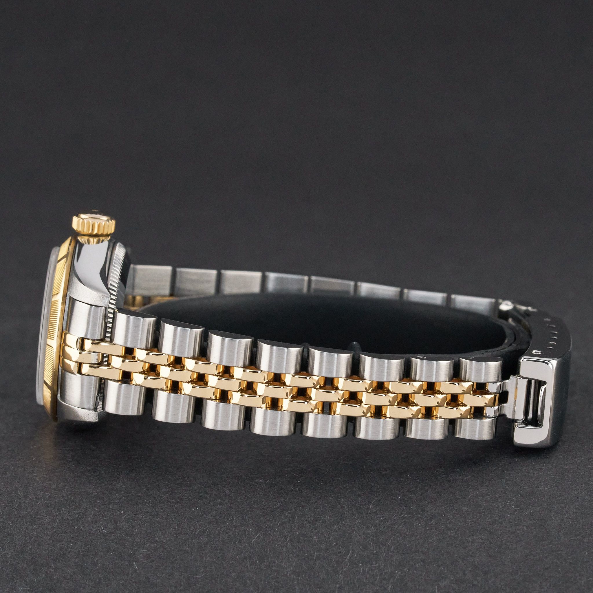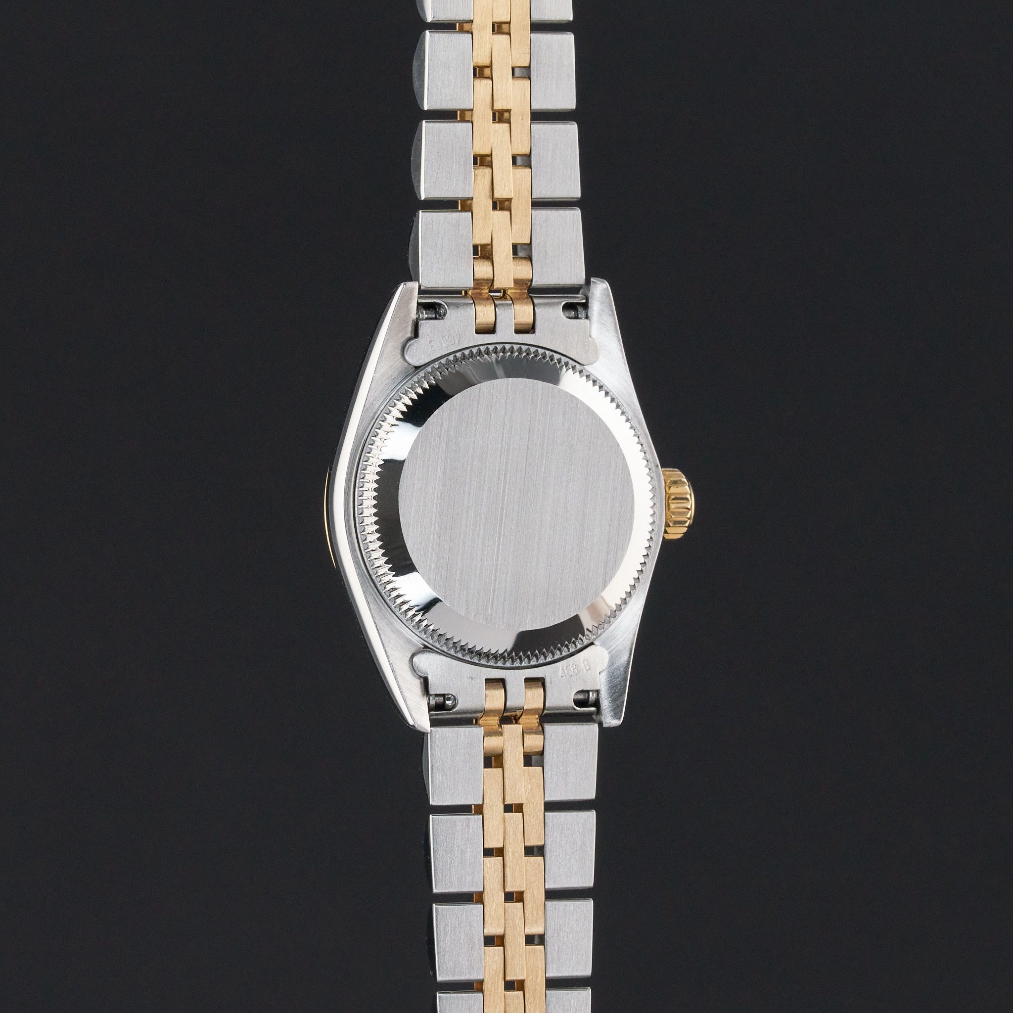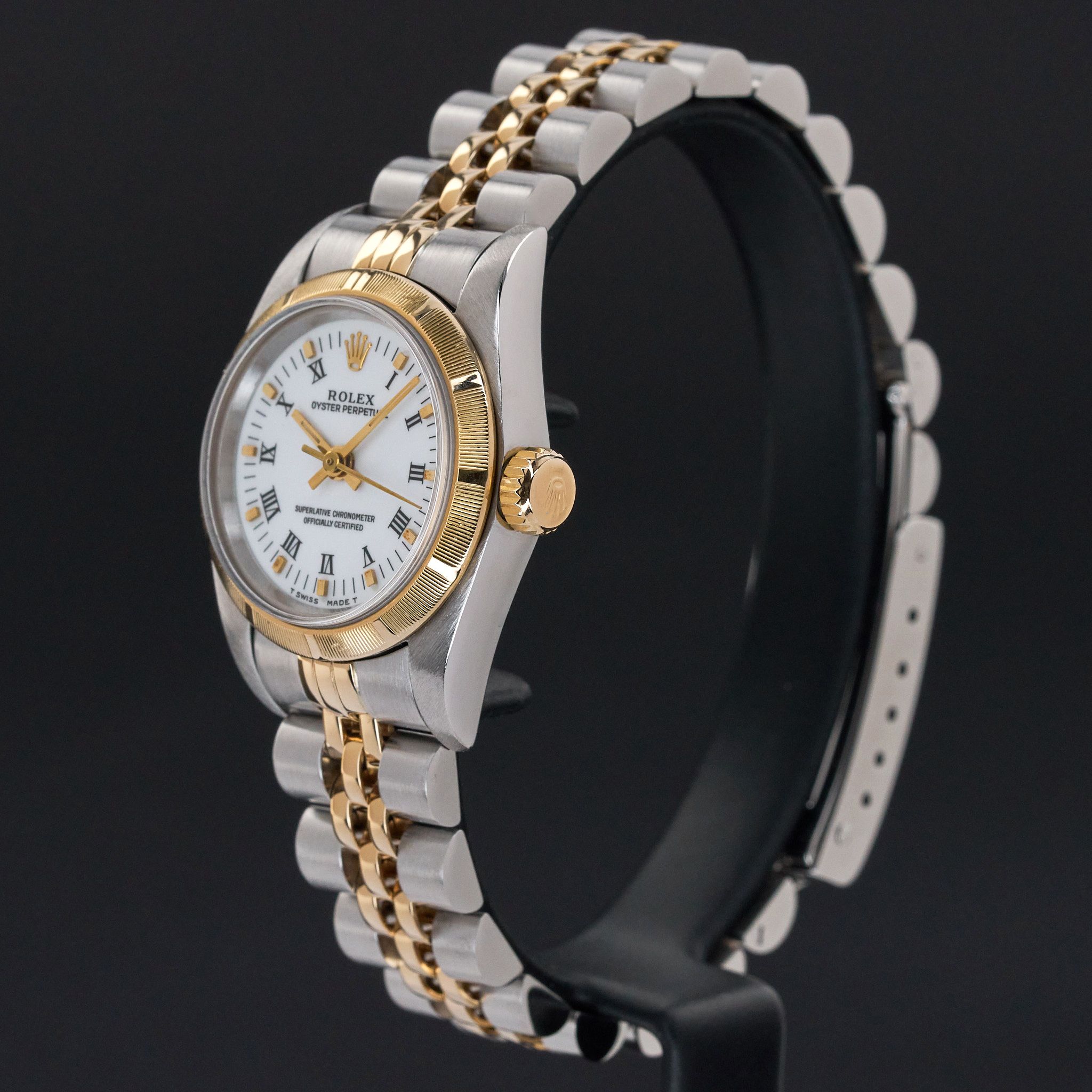 This Rolex Oyster Perpetual Lady 67233 features a White Roman dial and is crafted from 18K yellow gold and stainless steel, with a production year of 1993.Case No: S48XXXX