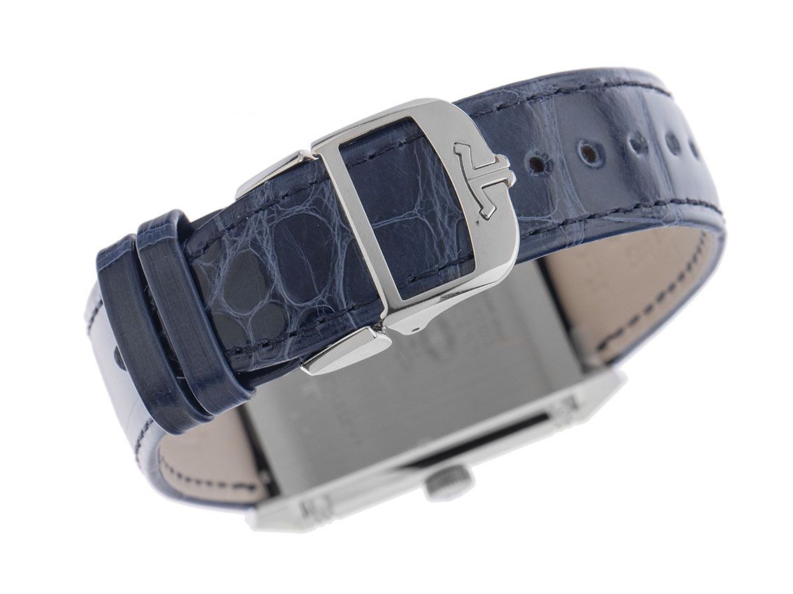 Caja de acero inoxidable pulido, rectangular, medidas de la caja sin corona (L x A x H) 34,2 x 21 x 8,9mm con caja reversible giratoria 180°. Parte trasera con 30 diamantes, en total aproximadamente 0,28ct. Correa de cocodrilo azul con costura decorativa, ancho de asas 15mm, cierre desplegable doble de acero inoxidable con logo del fabricante. Esfera delantera: plateada guilloché, cepillada verticalmente con números árabes negros y agujas azules, esfera trasera: negra guilloché con índices, números árabes y agujas pulidas. Movimiento manual, calibre de manufactura Jaeger-leCoultre 844 con 18 rubíes, reserva de marcha de aproximadamente 38 horas. Parte delantera: indicación de horas y minutos a través de agujas centrales, parte trasera: indicación de horas y minutos a través de agujas centrales. Cristal de zafiro resistente a los arañazos. Corona con logo del fabricante. Fondo de acero inoxidable grabado. Peso del reloj incluyendo la correa 40g. Resistente al agua hasta 3 ATM. Número de referencia: Q2668432, ID: ST1160174211125H-12400, número de artículo: 10000083328. Caja original Jaeger-leCoultre con caja exterior y documentos de garantía de agosto de 2025, así como descripción, Full Set. Sin usar. Tiempo de entrega inmediato.