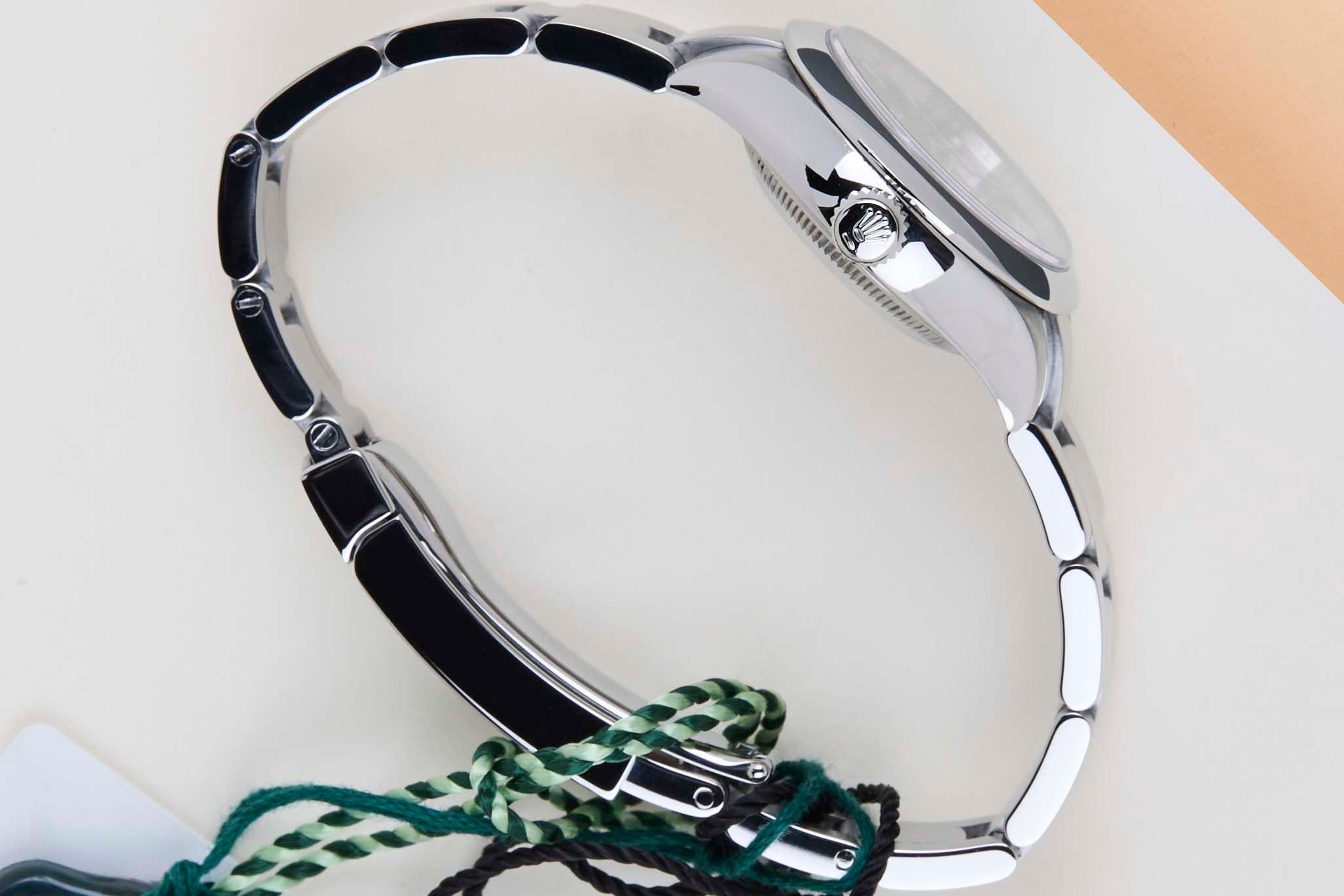 El Rolex Oyster Perpetual fue presentado por primera vez por Rolex en la década de 1930. Se caracteriza por su caja Oyster resistente al agua y su movimiento Perpetual de autoviento. El Rolex Oyster Perpetual es una pieza de tiempo simple, pero elegante, que es adecuada tanto para ocasiones informales como formales. Este Rolex Oyster Perpetual 28 ‘Esfera Negra’ se vendió por primera vez en junio de 2021. El reloj está completamente hecho de acero inoxidable. Rolex utiliza 904L en sus relojes de acero, que es una superaleación extremadamente resistente y altamente pulible. El reloj está equipado con una clásica 'Esfera Negra'. Este increíble Rolex Oyster Perpetual 28 'Esfera Negra' está en condiciones mint y viene con la Tarjeta de Garantía Original de Rolex y la Caja. Además, el reloj aún tiene Garantía Internacional de Rolex hasta junio de 2026.