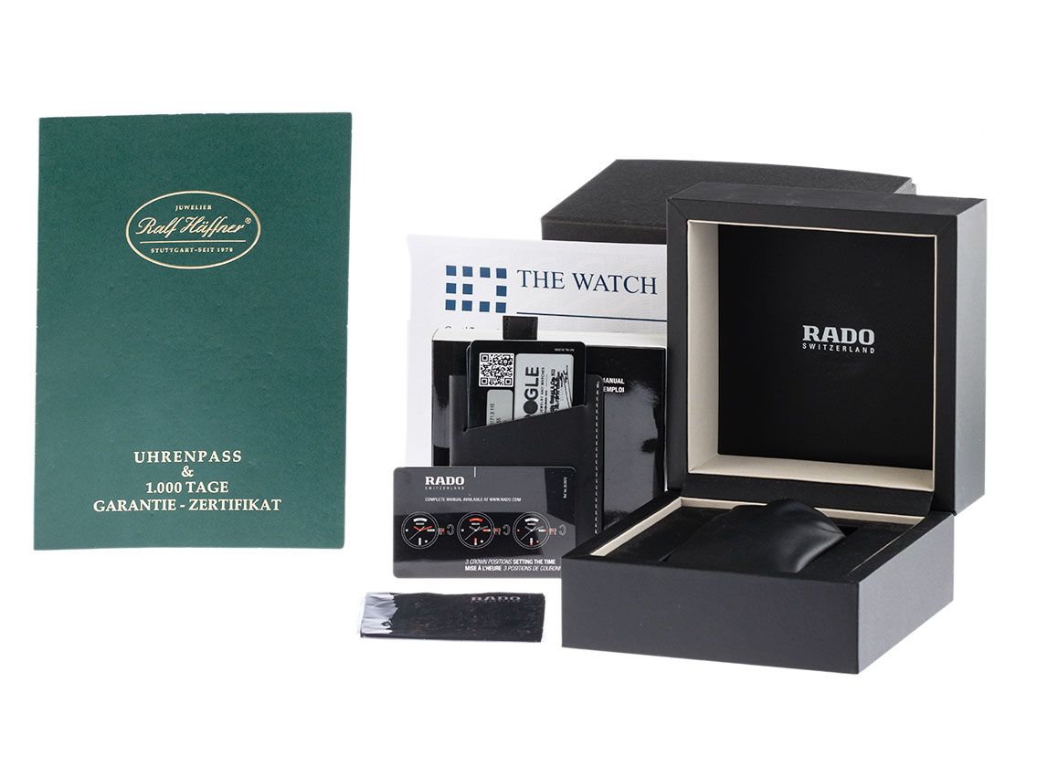 Caja de Cerámica de Alta Tecnología negra satinada, diámetro de la caja sin corona 46mm. Altura de la caja 14,1mm. Correa de cuero negra con costura decorativa, ancho de asa 27mm, cierre plegable de acero inoxidable con logo del fabricante. Esfera negra con índices de acero inoxidable y agujas de acero inoxidable. Movimiento automático calibre ETA AU38 con 25 rubíes. Indicador de hora, minuto y segundo a través de agujas centrales con parada de segundero para un ajuste preciso de la hora, indicador de fecha y día de la semana con ajuste rápido a las 6 en punto. Cristal de zafiro resistente a los arañazos. Corona de cerámica con protección lateral. Fondo de cerámica atornillado en dos partes y grabado. Peso del reloj incluyendo la correa 115g. Número de referencia: 01.764.0171.3.115, número de caja: 14782XXX, ID: KS131928001124H-3300, número de artículo: 10000077244. Con control de marcha y completa restauración exterior de noviembre de 2024 incluyendo 1000 días de garantía. Caja original de Rado con caja exterior y documentos de garantía de septiembre de 2017, así como extracto de Watchregister de noviembre de 2024, factura de compra y descripción y paño de pulido, set completo. Superoferta, casi no usado. Como nuevo. Tiempo de entrega inmediato. Tiempo de entrega inmediato.