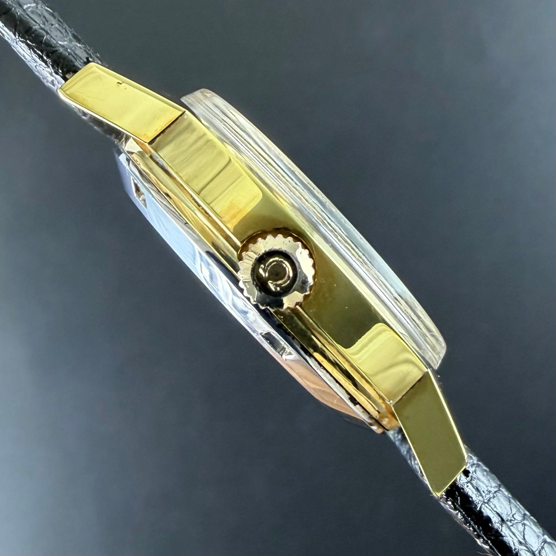 This vintage Omega Genève Day-Date, produced in 1972, features a 35mm steel case with gold plating. The plating is fully intact, showing sharp edges and no fading, and also the caseback retains its original polish. The white sunburst dial includes a day and date display at the 3 o’clock position, with weekdays available in English and both functions offering quick-set adjustment.Powering the watch is the automatic caliber 1022, fully serviced in November 2025 and now running excellently. We’ve paired the piece with a black calf leather strap, complementing its clean, elegant look. Overall condition is excellent, making it an ideal dress watch.