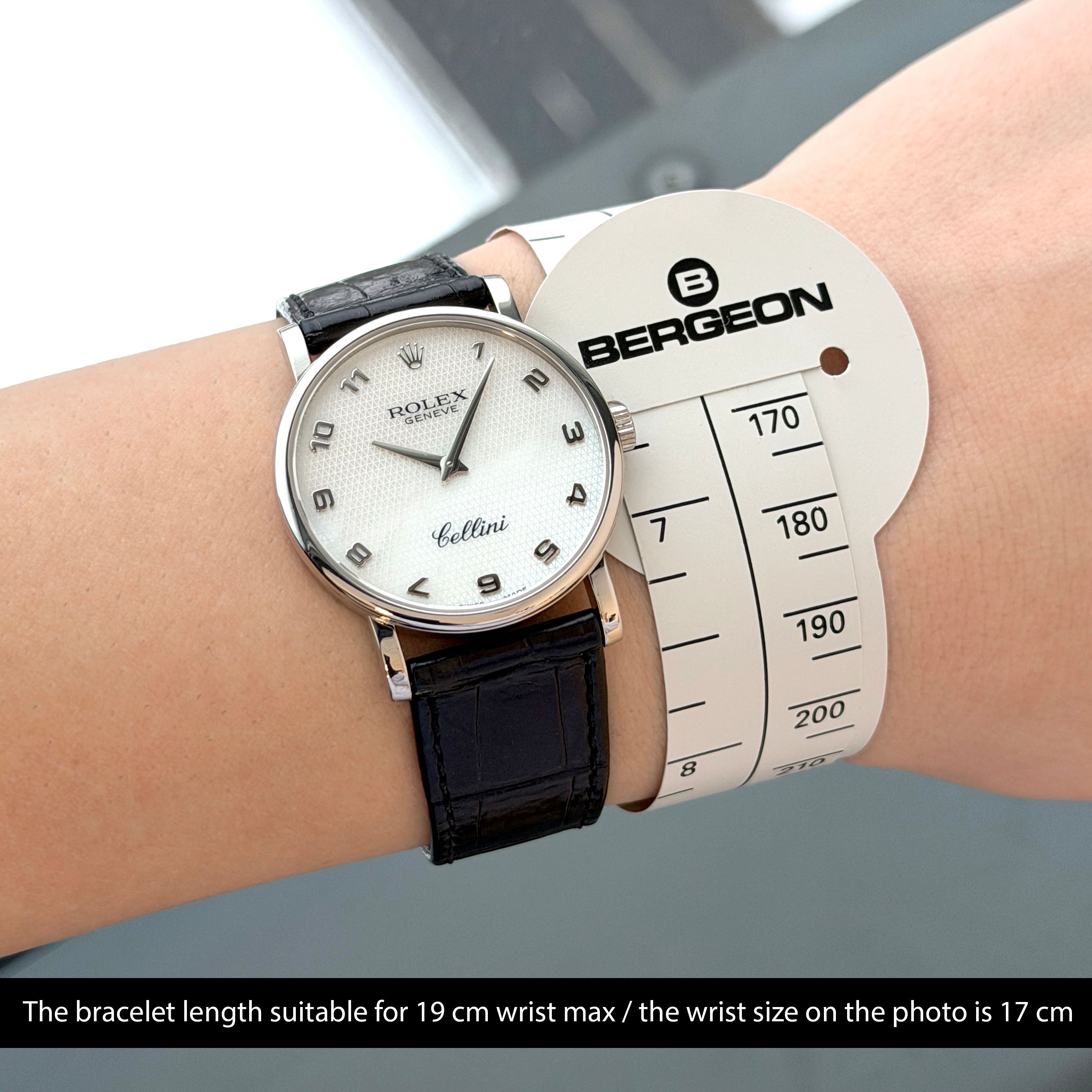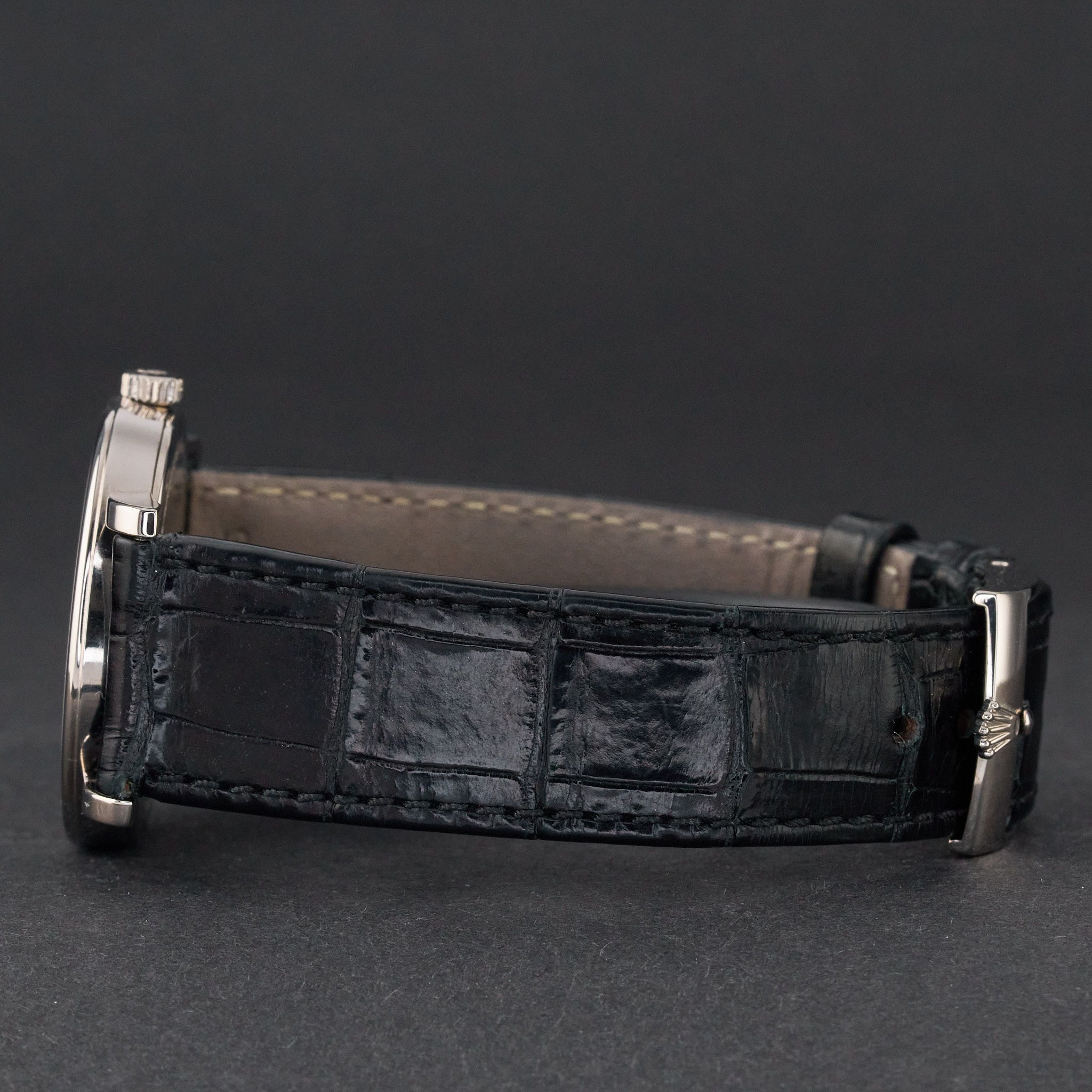 Este Rolex Cellini 5115 cuenta con una esfera de madreperla plateada con números árabes y está hecho de oro blanco de 18 quilates, con un año de producción de 2008.