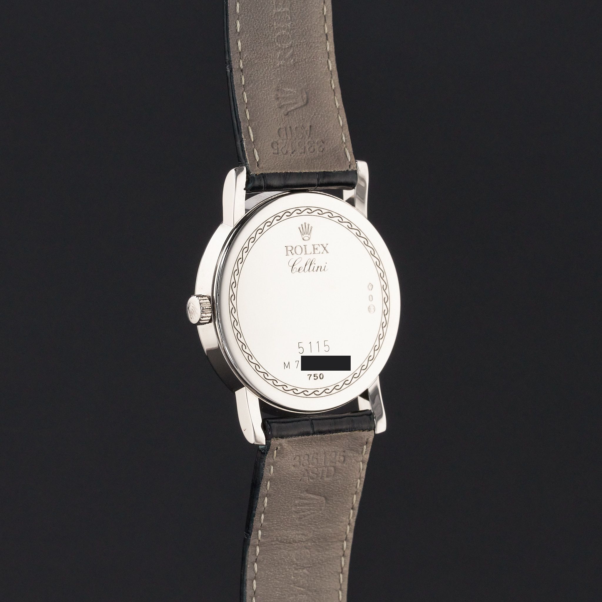 This Rolex Cellini 5115 features a Silver mother of pearl dial Arabic and is crafted from 18K white gold, with a production year of 2008.Case No: M77XXXX