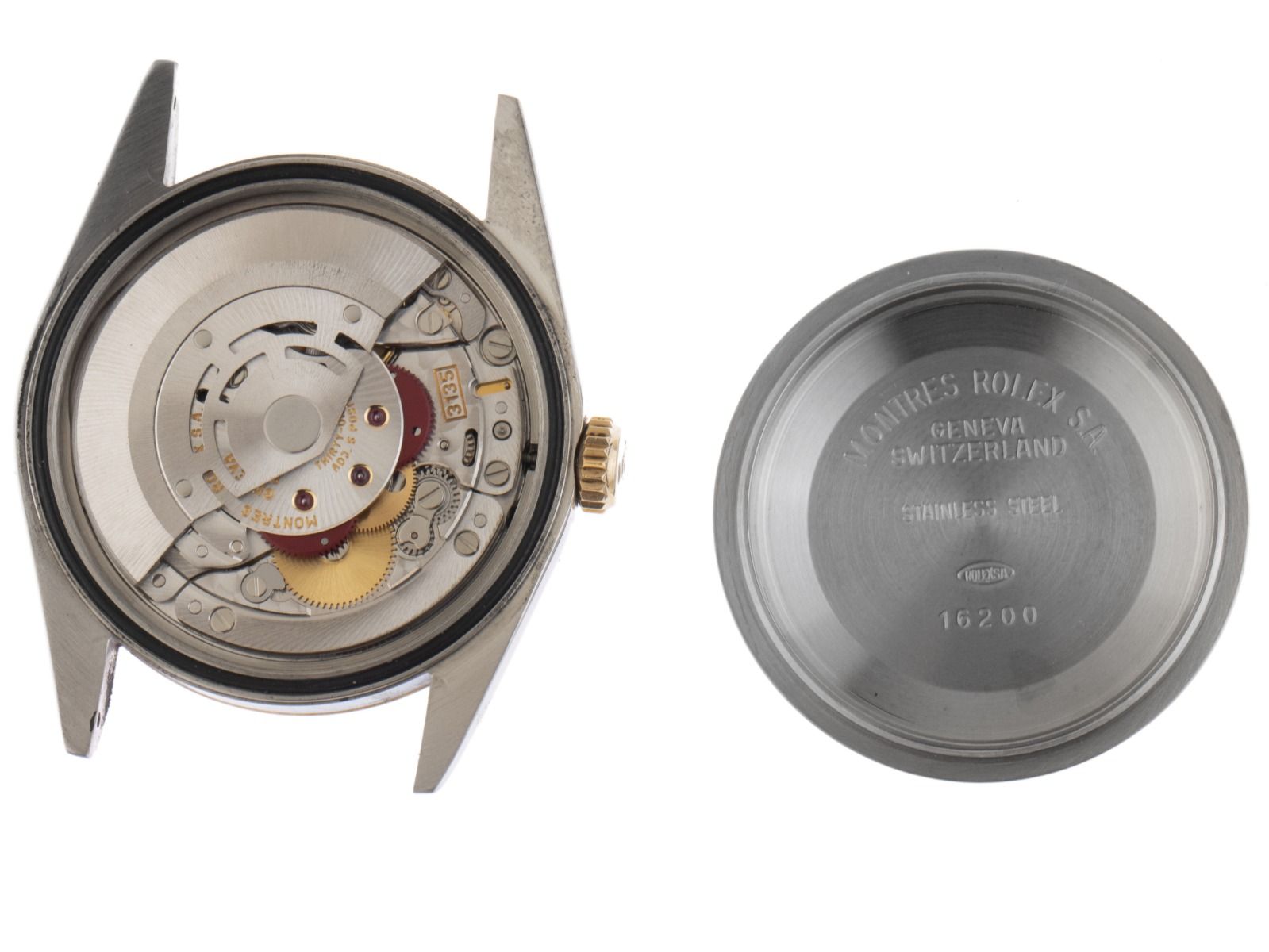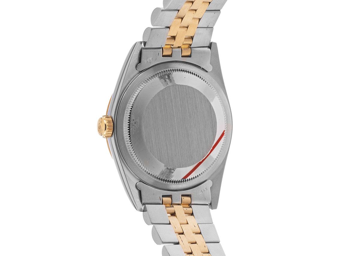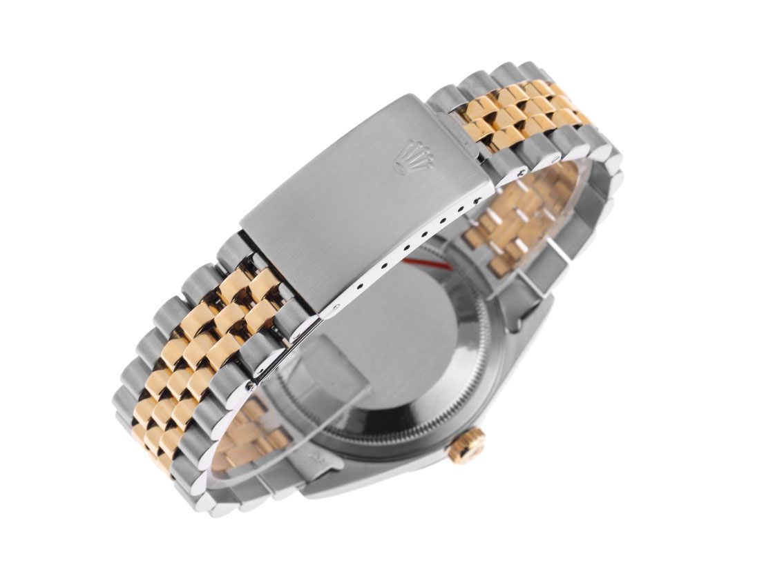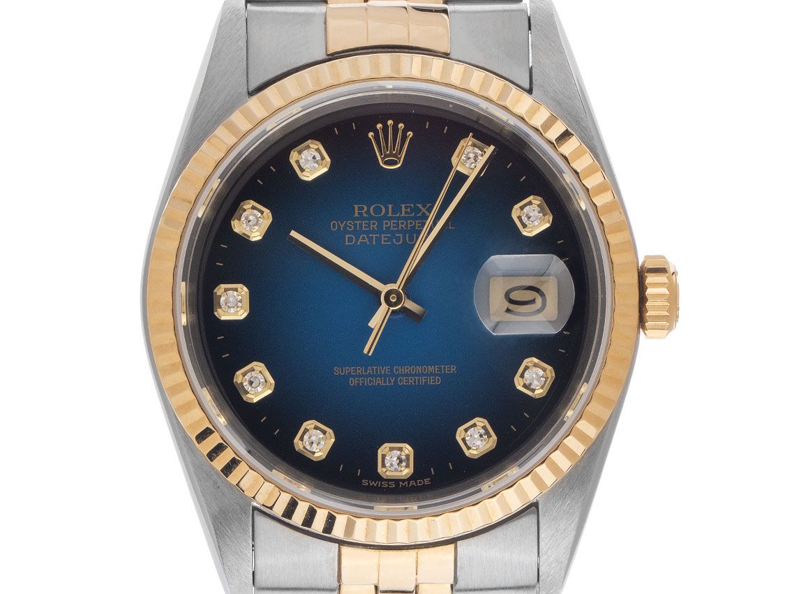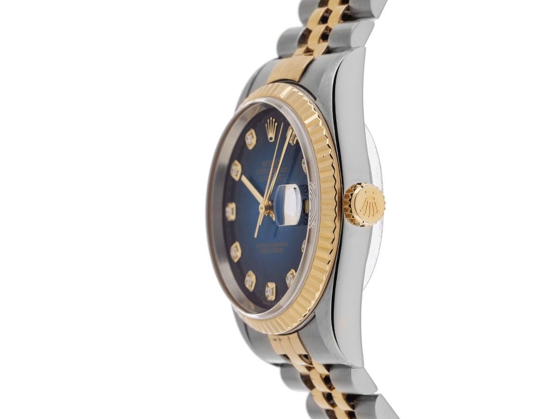 Caja de acero inoxidable pulido y satinado, diámetro de la caja sin corona 36mm, altura de la caja 11,6mm. Bisel de 18kt oro amarillo pulido y estriado. Pulsera Jubilé de acero inoxidable / 18kt oro amarillo pulido y satinado, cierre desplegable de acero inoxidable con logo del fabricante. Esfera azul / negra degradada con 10 índices de diamante engastados en oro amarillo y agujas en oro amarillo. Movimiento automático, cronómetro con certificado, calibre de manufactura Rolex 3135 con 31 piedras preciosas. Indicación de hora, minuto y segundo a través de agujas centrales con parada de segundos para un ajuste preciso de la hora, visualización de la fecha con ajuste rápido bajo lupa a las 3 en punto, open 6/9 (seis y nueve abiertas en la visualización de la fecha). Cristal de zafiro resistente a los arañazos. Corona atornillada con logo del fabricante. Fondo de acero atornillado. Peso del reloj incluyendo la pulsera 95g, longitud de la pulsera incluyendo la caja 165mm. Número de referencia: 16233, año de fabricación: 1996, número de caja: T535XXX, ID: P1958146001125H-12800, número de artículo: 10000083373. Con control de marcha y completa restauración exterior de noviembre de 2025. Caja original de Rolex con caja exterior y documentos de garantía de noviembre de 1989, LC 170 / Italia, así como descripción, estuche de cuero, folleto de traducción, sello de cronómetro Rolex y extracto del registro de relojes de noviembre de 2025, certificado de The Watch Register / sin entrada (base de datos internacional de relojes perdidos o robados), Full Set. Inversión con potencial de revalorización, pieza de colección extremadamente rara. Muy buen estado. Tiempo de entrega inmediato.