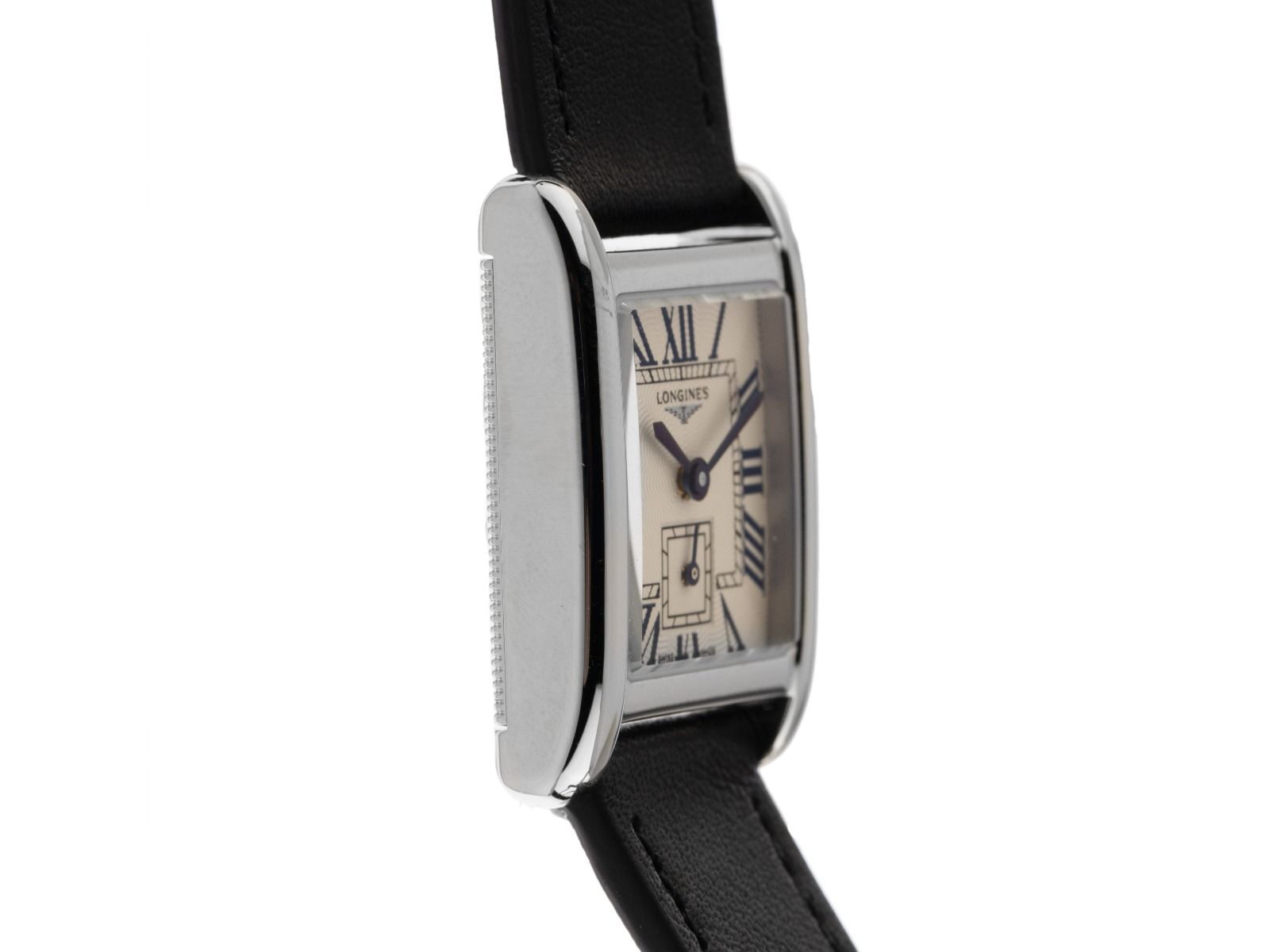Caja de acero inoxidable pulido, rectangular, medidas de la caja sin corona (L x An x Al) 29 x 21,4 x 7mm. Bisel de acero inoxidable liso y pulido. Pulsera de cuero negro, de tres filas con función de cambio rápido, ancho de asas 16mm, hebilla de pasador de acero inoxidable con logo del fabricante. Esfera plateada guilloché con números romanos y agujas azules. Movimiento de cuarzo, calibre Longines L178. Indicación de horas y minutos a través de agujas centrales, pequeño segundero con parada de segundos para un ajuste preciso de la hora a las 6 en punto. Cristal de zafiro resistente a los arañazos. Corona con logo del fabricante. Fondo de acero inoxidable grabado. Peso del reloj incluyendo la pulsera 25g. Resistente al agua hasta 3 ATM. Número de referencia: L5.200.4.71.0, ID: ST610221001225H-1750, número de artículo: 10000083583. Caja original de Longines con caja exterior y documentos de garantía de 2025, Full Set. Sin usar. Tiempo de entrega inmediato.