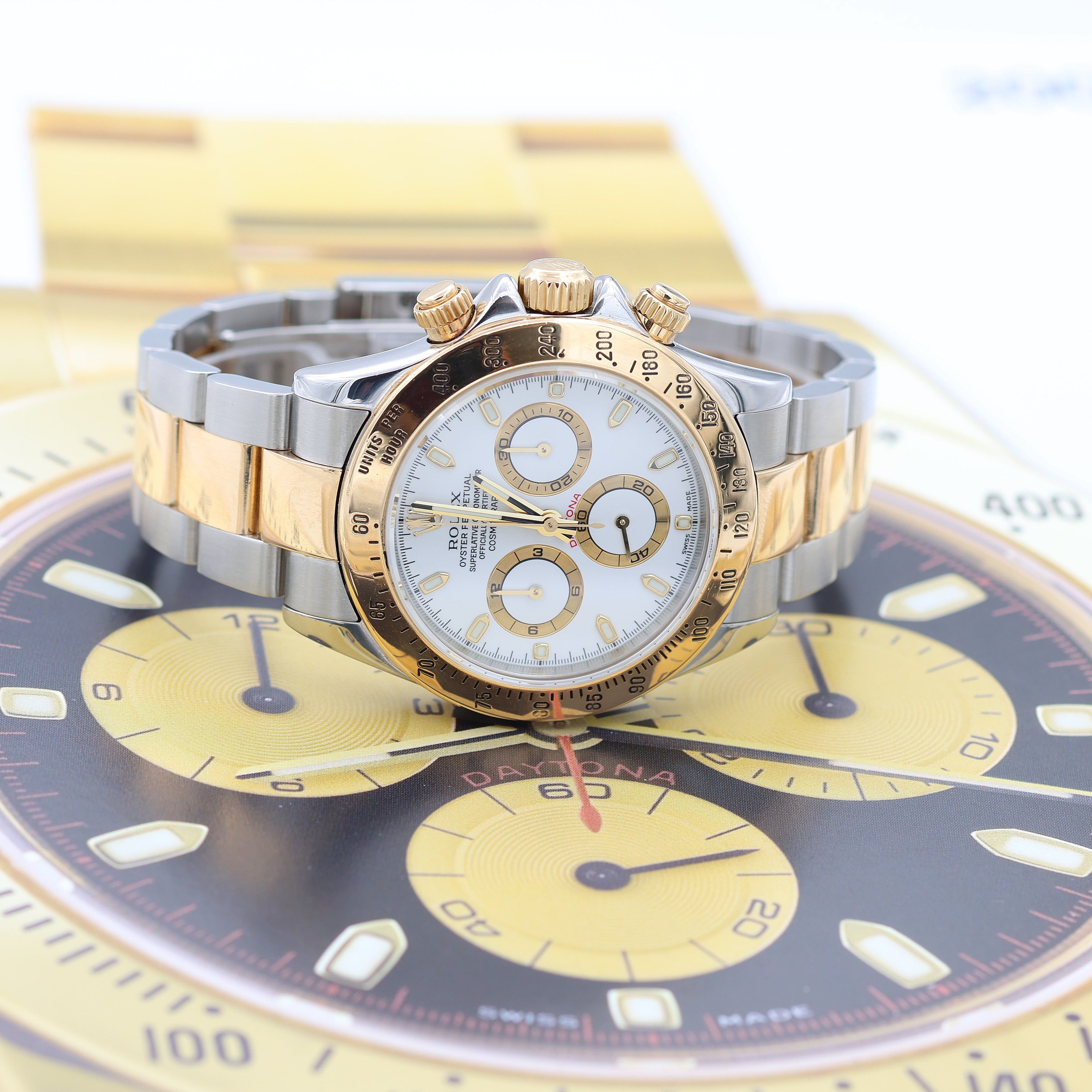 For sale at Debonar Watches: pre-owned Rolex Daytona 116523 in excellent conditions. With its two-tone coloring, steel and 18k gold, it has arguably the most versatility compared to its all steel and all gold stable mates. This chronograph was designed to be the ultimate timing tool for endurance racing drivers. More than 50 years after its creation, the Cosmograph Daytona remains in a class of its own among sport chronographs and continues to transcend time.Synonymous with excellence and reliability, this Rolex is designed for everyday wear, and depending on the model, perfectly suited for a wide range of sports and other activities.The Daytona is designed for those with a passion for driving and speed.Story:While the Daytona is now widely loved and worn by everyone from the newbie collector to your boss’s boss, the Rolex Daytona is firstly a racing watch.It was made for motorsport professionals and was named after the famous Daytona Beach in Florida, where numerous land speed records were broken.Introduced in 1963, the reference 6239 Daytona was the first Rolex chronograph with a tachymeter bezel that allowed its wearer to measure the speed of an object. The watch gained traction in the racing world but did not gain widespread acceptance until later, thanks in part to a handsome actor/race car driver named Paul Newman. Born in the late '80s, this reference became the first Cosmograph to offer a combination platter of metals.Over the years, the model has seen various updates and has become one of the most desirable watch models in the world. BRAND ROLEX MODEL DAYTONA REFERENCE 116523 CASE MATERIAL STEEL/GOLD MOVEMENT AUTOMATIC DIMENSION 40 MM DIAL WHITE BEZEL GOLD CRYSTAL SAPPHIRE BRACELET TYPE BRACELET BRACELET MATERIAL STEEL/GOLD BRACELET LENGHT 17 CM ORIGINAL BOX NO ORIGINAL PAPERS NO YEAR APPROX. '00s CONDITION EXCELLENT