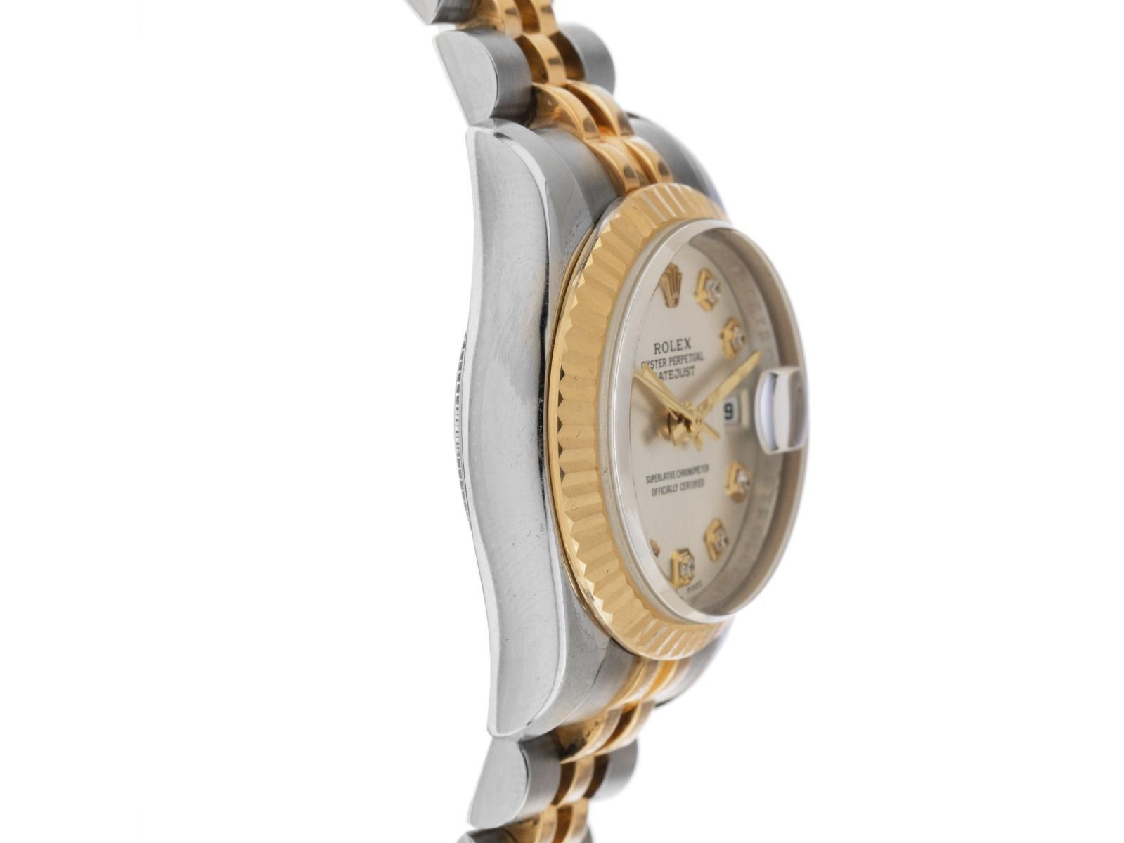 Caja de acero inoxidable pulido y satinado, diámetro de la caja sin corona 26mm, altura de la caja 11,1mm, bisel de oro amarillo de 18kt estriado y pulido. Pulsera Jubilé de acero inoxidable / oro amarillo de 18kt pulido y satinado, cierre desplegable Rolex Crown-Clasp oculto con logo del fabricante. Esfera de color plateado con 10 índices de diamante engastados en oro amarillo y agujas doradas. Movimiento automático, cronómetro con certificado, calibre de manufactura Rolex 2235 con 31 rubíes. Indicación de hora, minuto y segundo a través de agujas centrales con parada de segundero para un ajuste preciso de la hora, visualización de la fecha con ajuste rápido bajo lupa a las 3 en punto. Cristal de zafiro resistente a los arañazos. Corona atornillada con logo del fabricante. Fondo de acero atornillado, peso del reloj incluyendo la pulsera 74g, longitud de la pulsera incluyendo la caja 145mm. Número de referencia: 179173, número de caja: 66F20XXX, ID: P2055128001225H-, número de artículo: 10000083622. Con control de marcha y completa restauración exterior de diciembre de 2025. Caja original de Rolex con caja exterior y documentos de garantía de abril de 2013, LC 413 / Corea del Sur, estuche de cuero, descripción, sello de cronómetro Rolex, folleto de traducción y extracto del registro de relojes de diciembre de 2025, certificado de The Watch Register / sin entrada (base de datos internacional de relojes perdidos o robados), Full Set. Super oferta, inversión con potencial de aumento de valor, pieza de colección muy rara. Como nueva. Tiempo de entrega inmediato.
