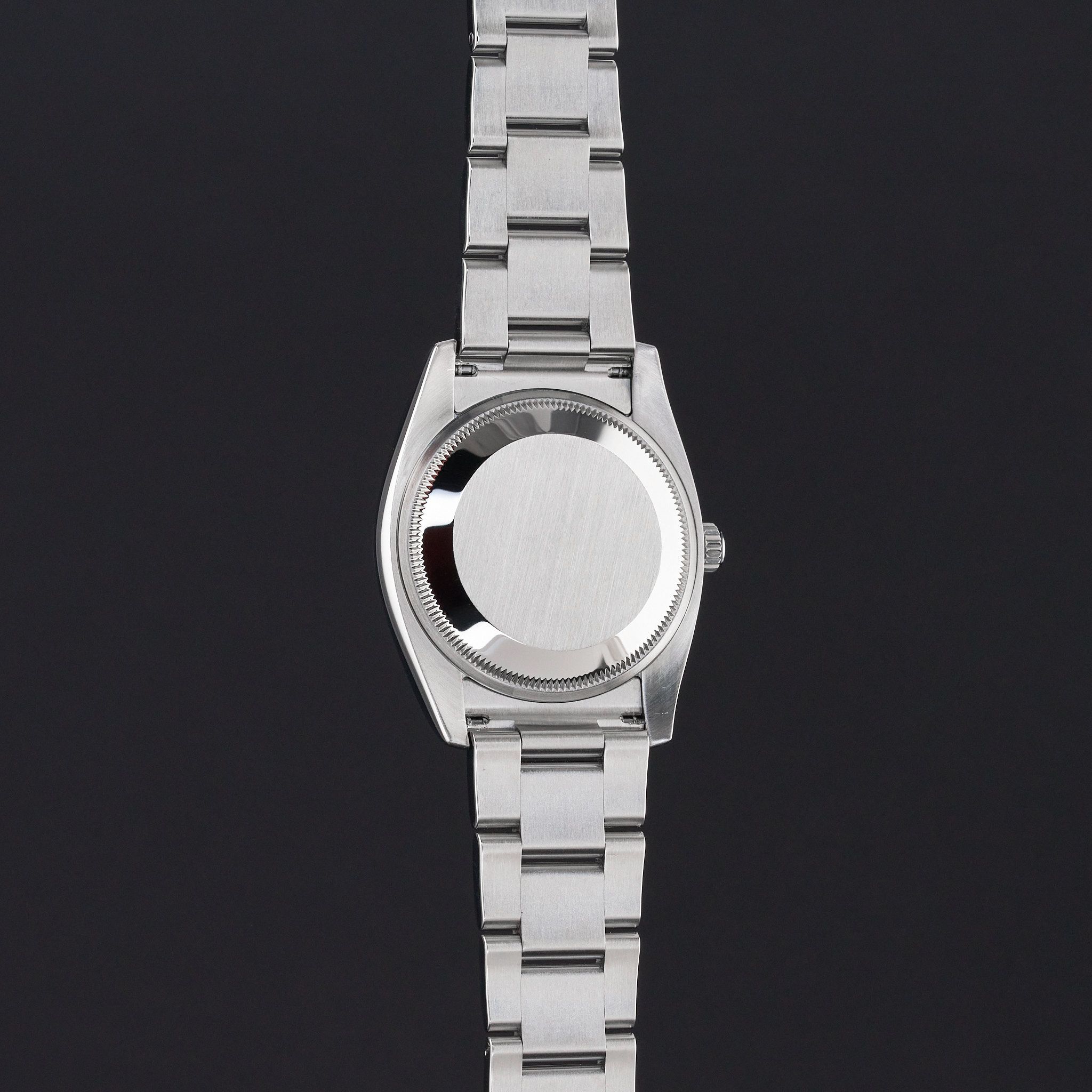Este Rolex Oyster Perpetual Date 115234 cuenta con una esfera azul y está fabricado en acero inoxidable.