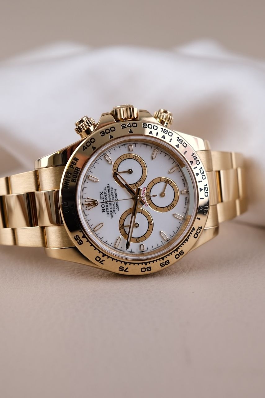 **Watch Description**Ready for your new dream watch? Perhaps this beautiful Rolex Daytona made of Yellow gold will soon be on your wrist. Whether vintage or modern - with over 200 watches in stock, we always have your new luxury watch available for you immediately - whether you are a first-time buyer or your watch collection needs a new addition.