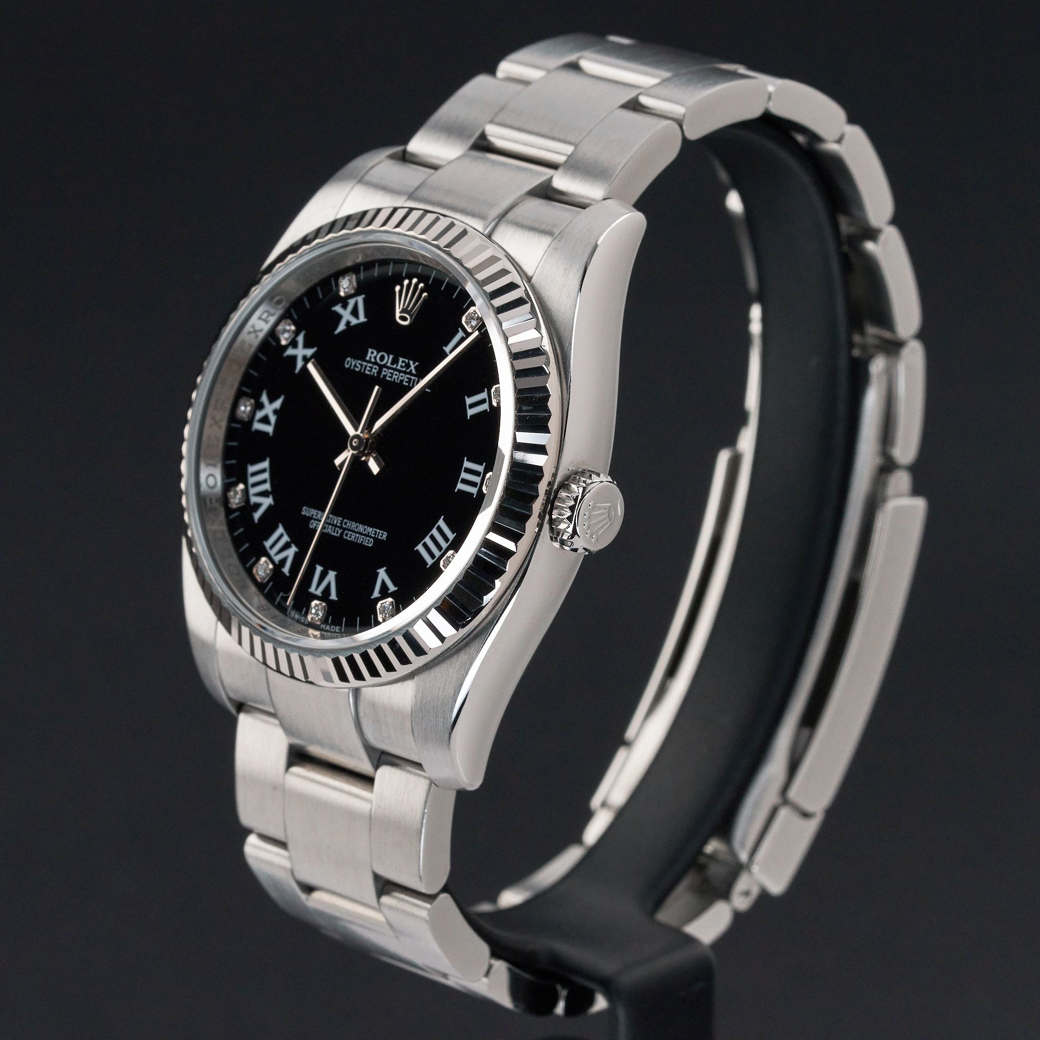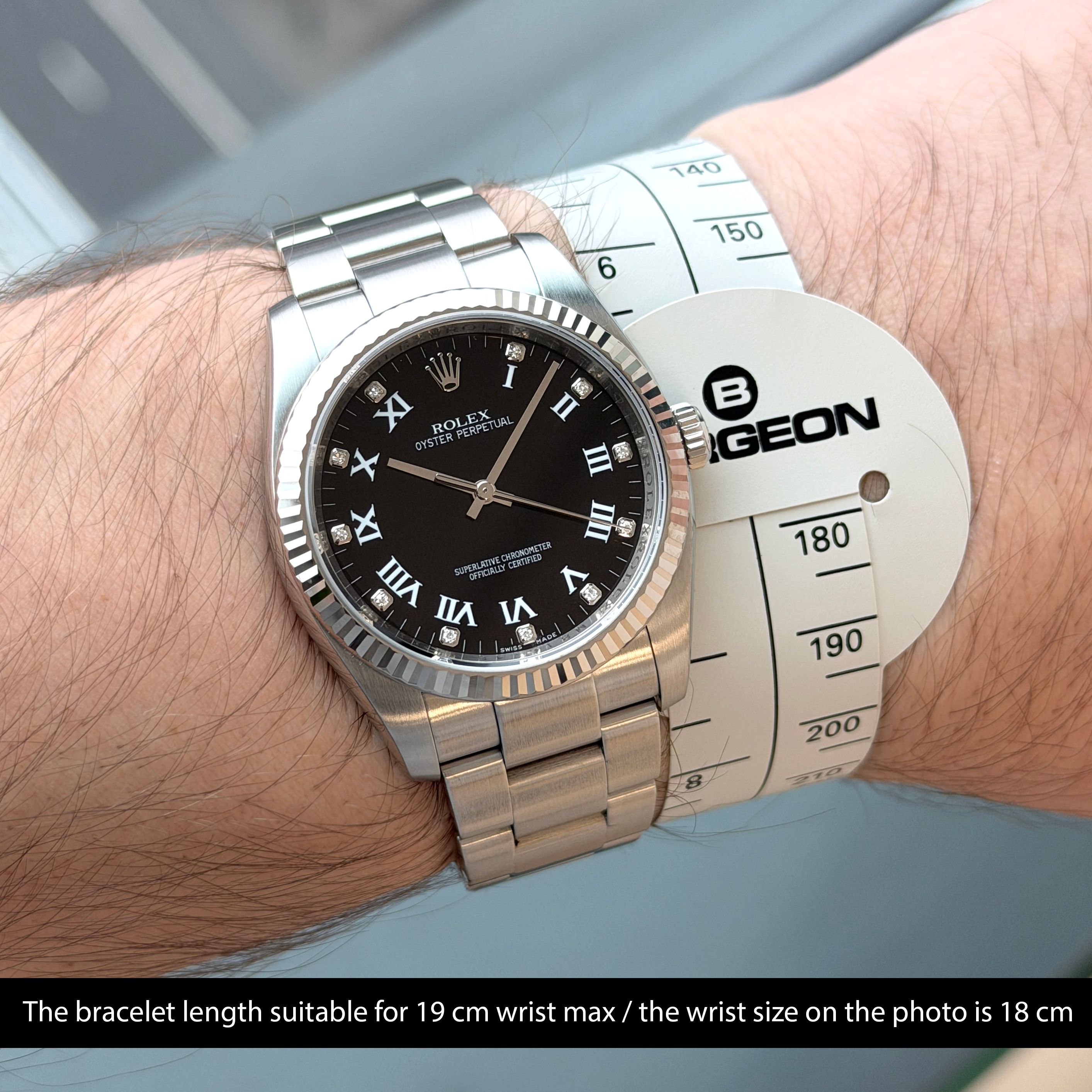 This Rolex Oyster Perpetual 116034 features a Black Roman diamond dial and is crafted from stainless steel, with a production year of 2008.Case No: M81XXXX