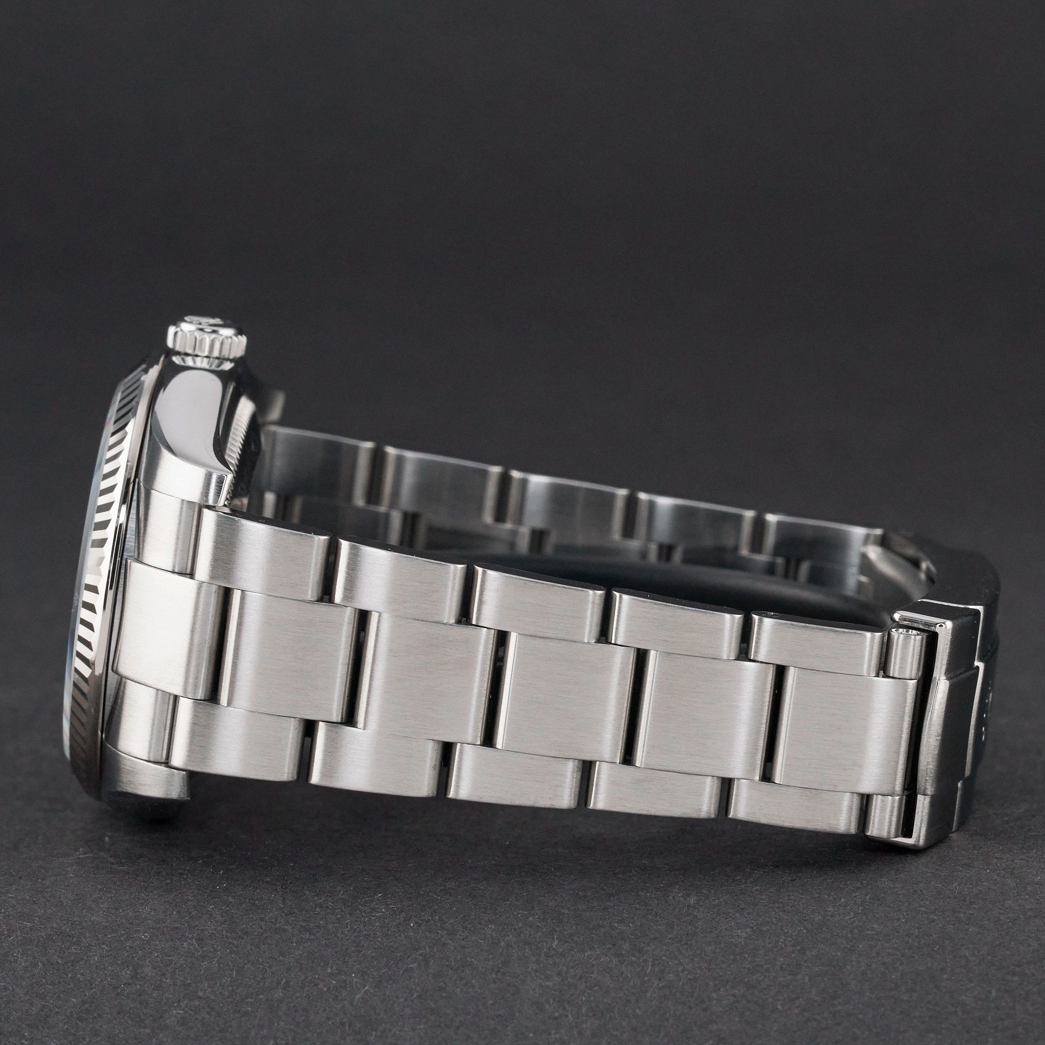Este Rolex Oyster Perpetual 116034 cuenta con una esfera de diamante negra con números romanos y está fabricado en acero inoxidable, con un año de producción de 2008.