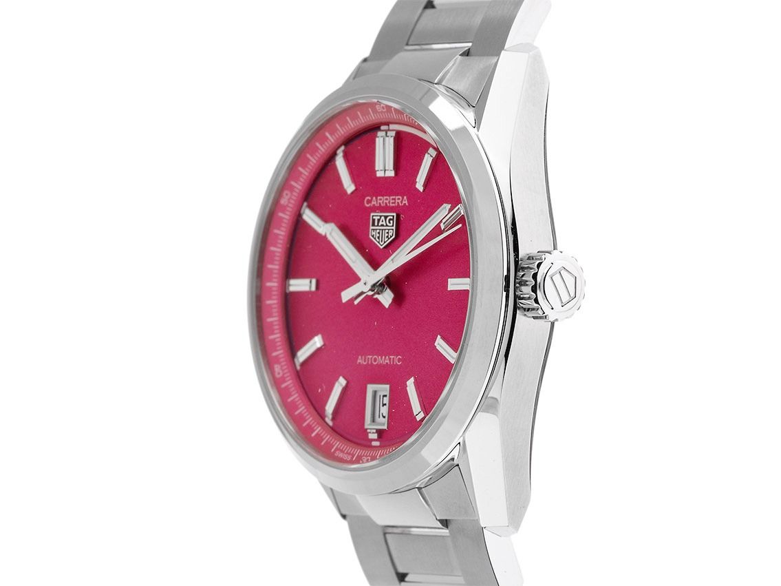 Tag Heuer Carrera Date Stahl Automatik Armband StahlGehäuse Edelstahl poliert, Gehäusedurchmesser ohne Krone 36mm, Gehäusehöhe 10,1mm. Lünette Edelstahl glatt und poliert. Armband Edelstahl poliert und satiniert, Sicherheitsfaltschließe Edelstahl mit Hersteller-Logo. Zifferblatt rosa mit aufgesetzten Indexen und Leuchtzeigern. Uhrwerk Automatik, Kaliber Tag Heuer Calibre 7 mit 25 Edelsteinen, Gangreserve ca. 50 Stunden. Anzeige von Stunde, Minute und Sekunde über Zeiger aus der Mitte mit Sekundenstopp zur sekundengenauen Einstellung der Uhrzeit, Datumsanzeige mit Schnellverstellung bei 6 Uhr. Saphirglas kratzfest und gewölbt. Krone mit Hersteller-Logo. Boden Edelstahl verschraubt und graviert mit Saphirglas Sichtfenster. Gewicht der Uhr inklusive Armband 112g, Länge des Armbandes inklusive Gehäuse 200mm. Wasserdicht bis 5 ATM. Referenznummer: WBN2313.BA0001, ID: ST610241401225H-3450, Artikelnummer: 10000083695. Original Tag Heuer Box mit Umkarton und Garantie Papiere von 2025 sowie Beschreibung, Full Set. Ungetragen. Lieferzeit sofort.