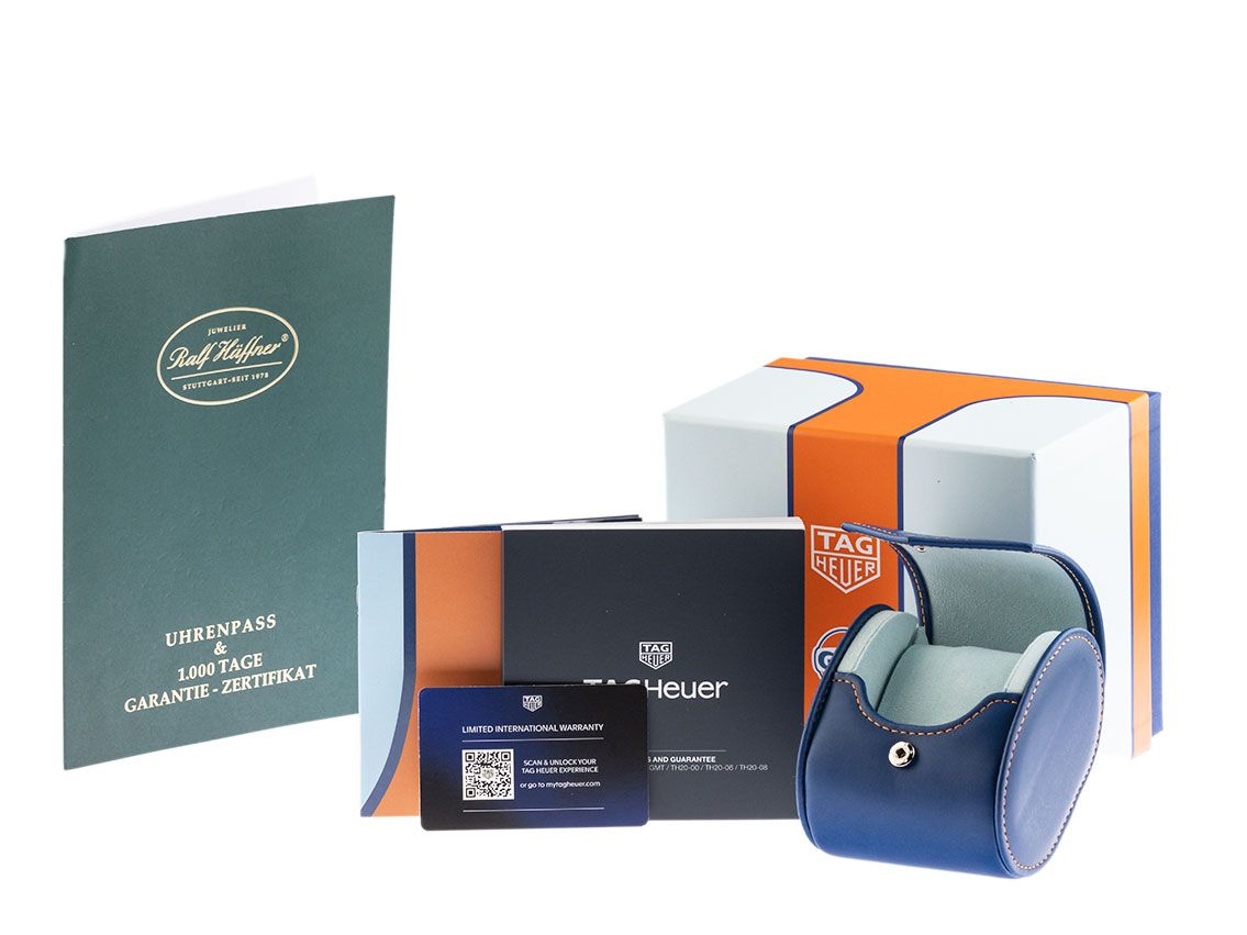 Caja de acero pulido y satinado, rectangular, medidas de la caja sin corona (L x A x H) 39 x 39 x 15,0 mm. Correa de piel azul oscuro con costura decorativa, ancho de asas 22 mm, cierre plegable de acero con logo del fabricante. Esfera azul / naranja, con índices luminosos aplicados y agujas luminosas de acero. Movimiento automático, calibre de manufactura Tag Heuer Calibre Heuer TH20-00 con 33 rubíes, reserva de marcha de aproximadamente 80 horas. Indicación de horas y minutos a través de agujas centrales, segundero pequeño con parada de segundos para ajuste preciso de la hora a las 3 en punto, visualización de la fecha con ajuste rápido a las 6 en punto. Cristal de zafiro resistente a los arañazos. Corona con logo del fabricante. Fondo de acero atornillado en 4 puntos y grabado con ventana de cristal de zafiro. Peso del reloj incluyendo la correa 124 g. Resistente al agua hasta 10 ATM. Número de referencia: CBL2115.FC6494, ID: ST610296601225H-8050, número de artículo: 10000083704. Caja original de Tag Heuer con caja exterior y documentos de garantía de 2025, así como descripción, Full Set. Sin usar. Tiempo de entrega inmediato.